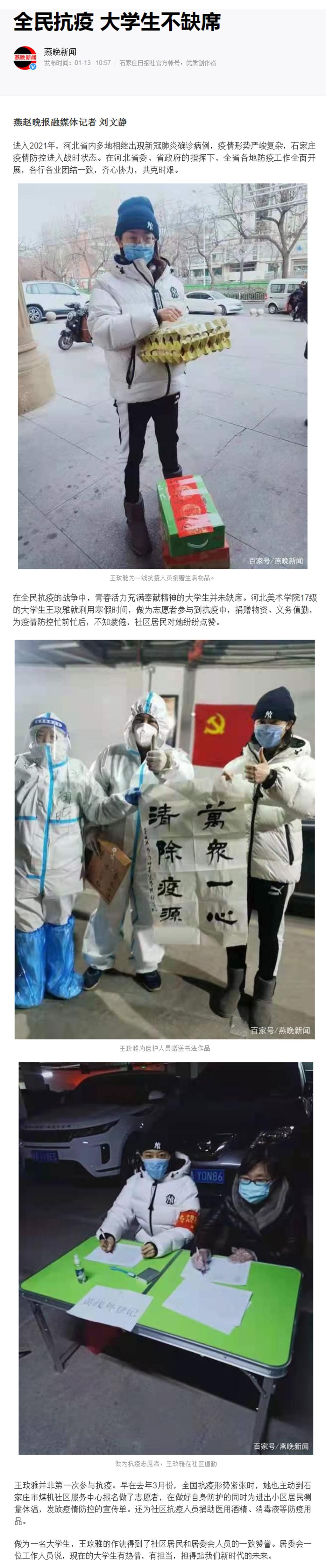 2021年1月13日,燕赵晚报以《全民抗疫 大学生不缺席》为题报道了beat365官网书法学院2017级学生王玫雅做抗疫志愿者的事迹。全文如下: 相关链接:https://mbd.baidu.com/newspage/data/landingsuper?context=%7B%22nid%22%...