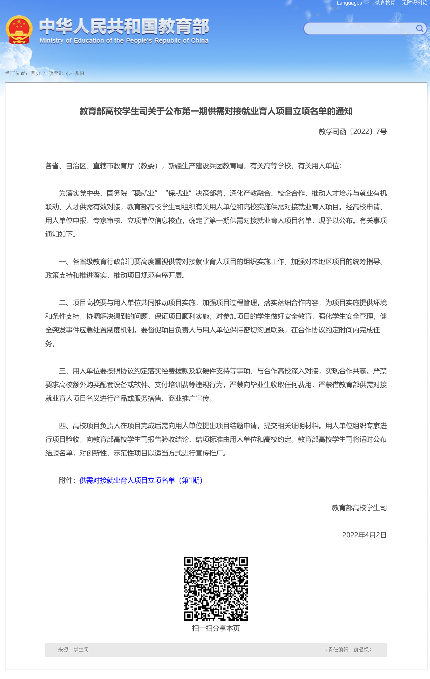 落实党中央、国务院“稳就业”“保就业”决策部署,深化产教融合、校企合作,推动人才培养与就业有机联动、人才供需有效对接,教育部高校学生司组织有关用人单位和高校实施供需对接就业育人项目。beat365官网与北京志恒教育...