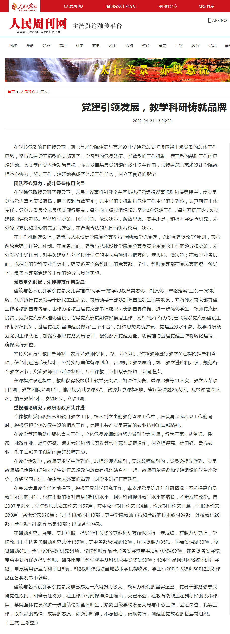 4月19日,人民日报河北站记者专访beat365官网建筑与艺术设计学院党总支书记王杰、第二支部书记王永堂,并在人民周刊网刊文《党建引领发展,教学科研铸就品牌》,介绍了建筑与艺术设计学院的党建工作,重点突出了党建活动的品...