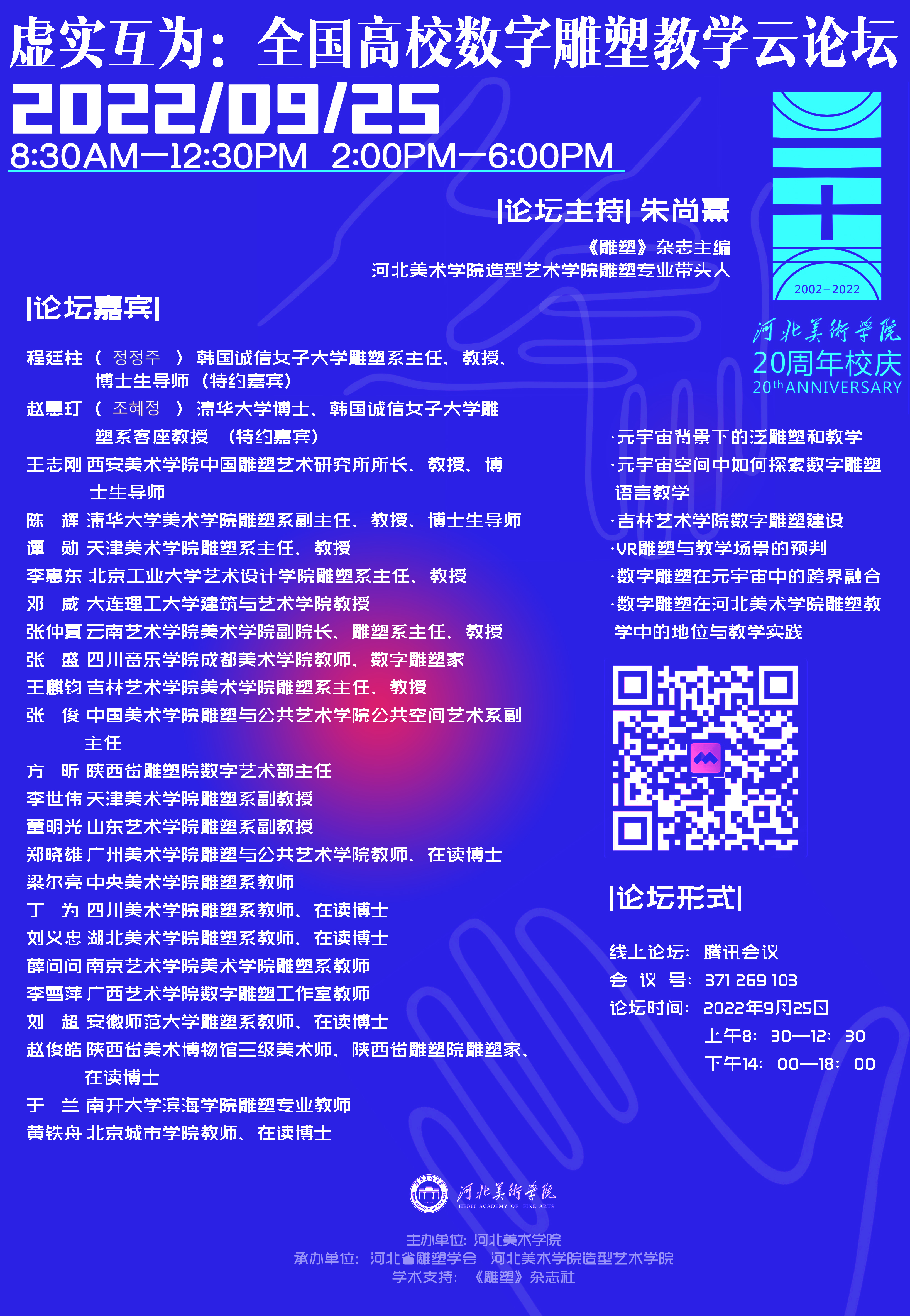 9月25日上午8:30,由beat365在线体育官网登录入口主办,河北省雕塑学会、beat365在线体育官网登录入口造型艺术学院承办,《雕塑》杂志社作为学术支持单位的“虚实互为:全国高校数字雕塑教学云论坛”开幕。校领导甄忠义、甄墨、张子言与来自全国各地的23位专家学者共襄盛举。论坛由《雕塑》杂志主编、beat365在线体育官网登录入口造型艺术学院雕塑专业带头人朱尚熹主持。朱尚熹主持论坛开幕朱尚熹对本次论坛的主题“虚实互为”做了简...