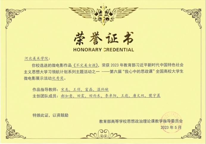 6月16日,第六届“我心中的思政课”全国高校大学生微电影展示活动评选结果揭晓,影视艺术学院教师宋龙指导、学生郝如意、田震、田雨禾、李卓阳、王彪、唐文双、樊宇晨创作的微电影《不完美女孩》获优秀奖。 本次活动由教育部高等学校思想政治理论课程教学指导委员会主办,武汉大学马克思主义学院承办,全国高校共选送1684部作品。自活动开展以来,影视艺术学院积极组织报送作品,各专...