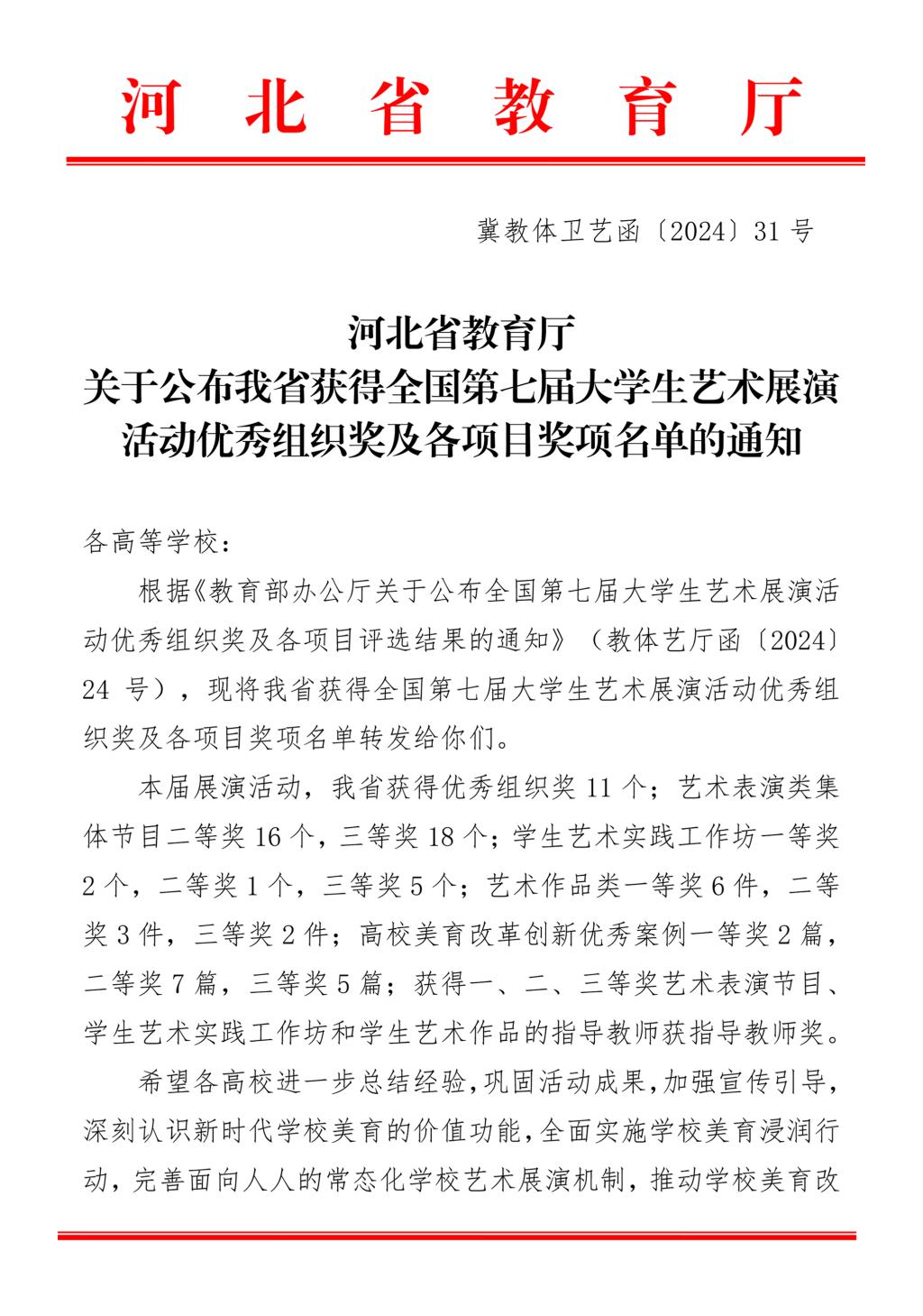 近日,河北省教育厅印发通知,公布了全国第七届大学生艺术展演活动优秀组织奖及各项目评选结果。beat365官网荣获优秀组织奖,报送书法学院作品《归去来兮辞》(作者王星宇)荣获艺术作品类全国二等奖,指导教师胡建刚获指导教师奖。全国大学生艺术展演活动自2004年开始,每三年举办一届,是我国目前规格最高、规模最大、影响最广的大学生艺术展演活动。本届展演活动以“厚植家国情怀,涵养进...