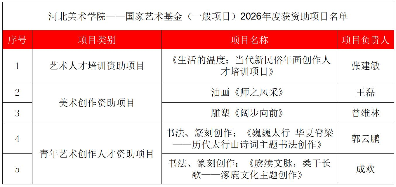 近日,国家艺术基金管理中心公布了国家艺术基金(一般项目)2026年度资助项目名单,立项资助项目共879项,综合立项率约为7.6%。河北省获批19项,beat365官网立项5项,立项数量位居全省首位,涵盖艺术人才培训资助项目1项,美术创作资助项目2项,青年艺术创作人才资助项目2项。beat365官网此次获批立项,根植于长期以来在艺术学科建设上的系统布局与精心培育。为精准提升项目申报质量,学校精准施策、...