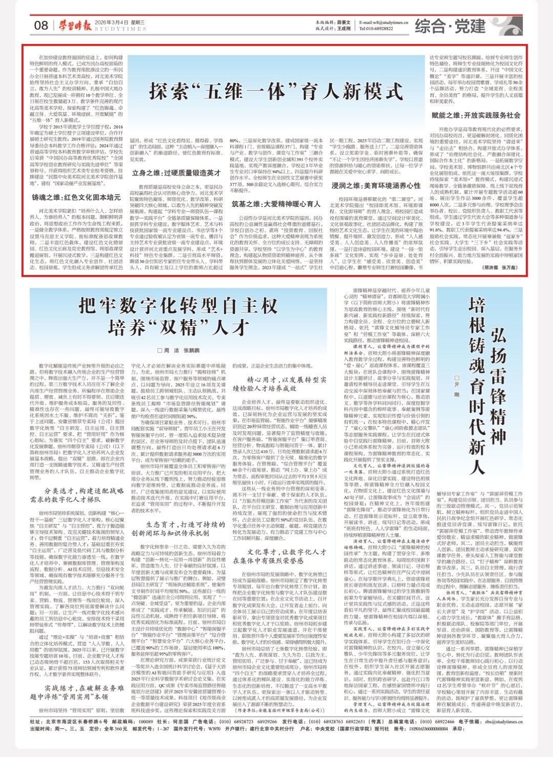 3月4日,中共中央党校主管主办的《学习时报》在第8版显著位置,以《探索“五维一体”育人新模式》为题,深度报道了beat365官网在加快建设教育强国背景下,扎根中国大地办教育,构建并实践“红色铸魂、卓越立身、大爱筑基、环境浸润、开放赋能”“五维一体”育人新模式的探索历程与显著成效。《学习时报》作为面向全国、服务全党的权威报刊,是国内外公开发行的全党唯一专门讲学习的报纸。自19...