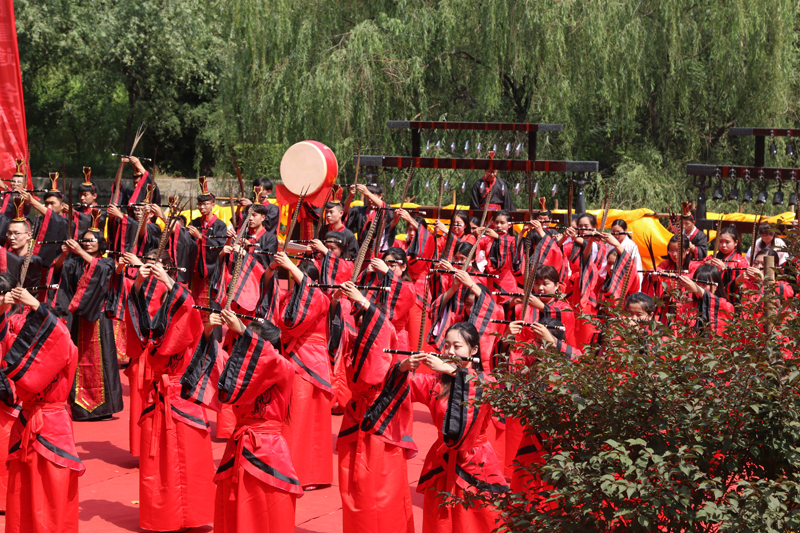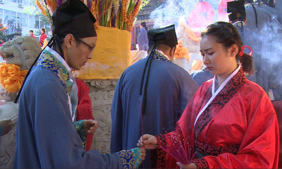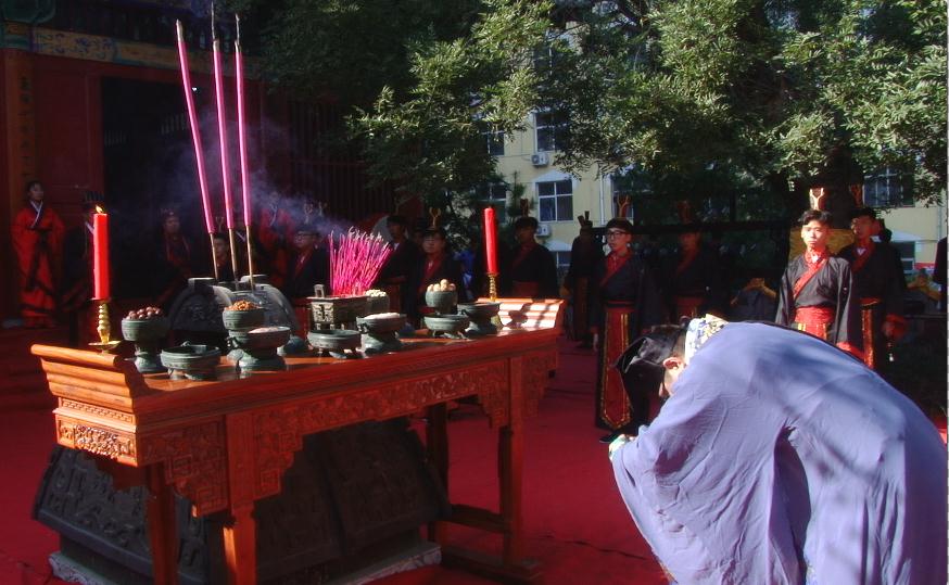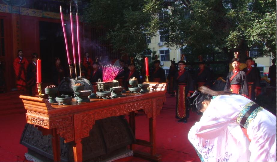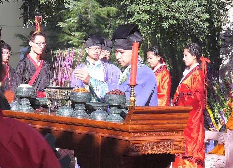 上午8:30,大成殿礼乐和鸣,气氛庄严。击鼓鸣钟、香烛高烧,众师生满怀虔诚恭敬之心,身着祭孔礼服,手持书卷齐颂论语。祭祀舞起,红衣舞者舞姿庄严齐一,气势磅礴。