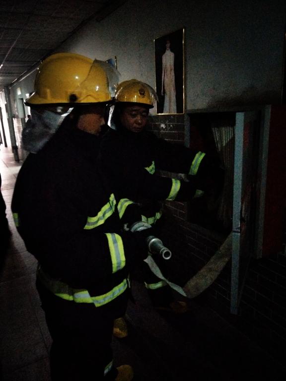 消防队员利用室内消火栓铺设水带水枪进行灭火,顺利控制火势,将火灾扑灭。