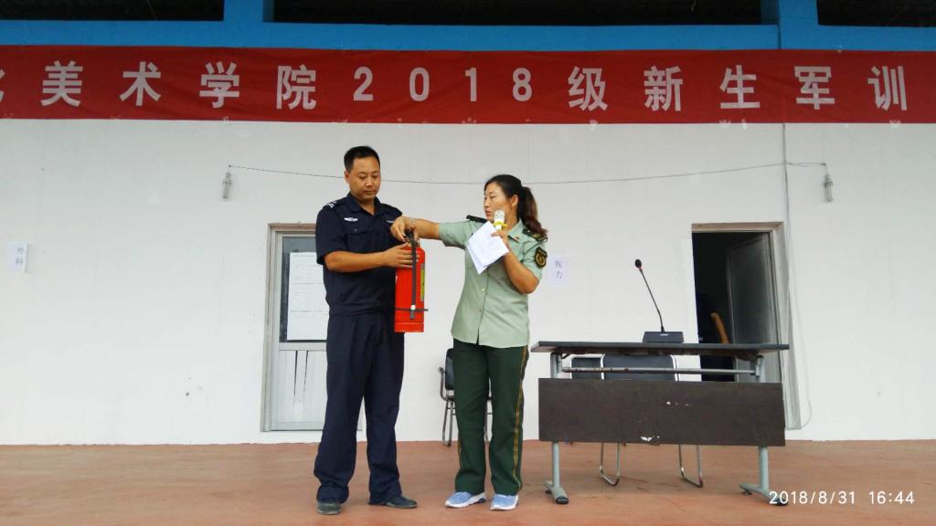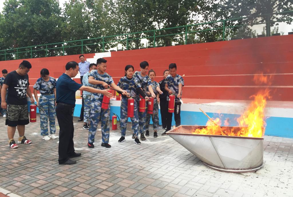 随后,大一新生们在体育场实地进行了灭火演练。安全工作处、新乐市消防大队等领导手把手指导学生使用灭火器等消防设备。