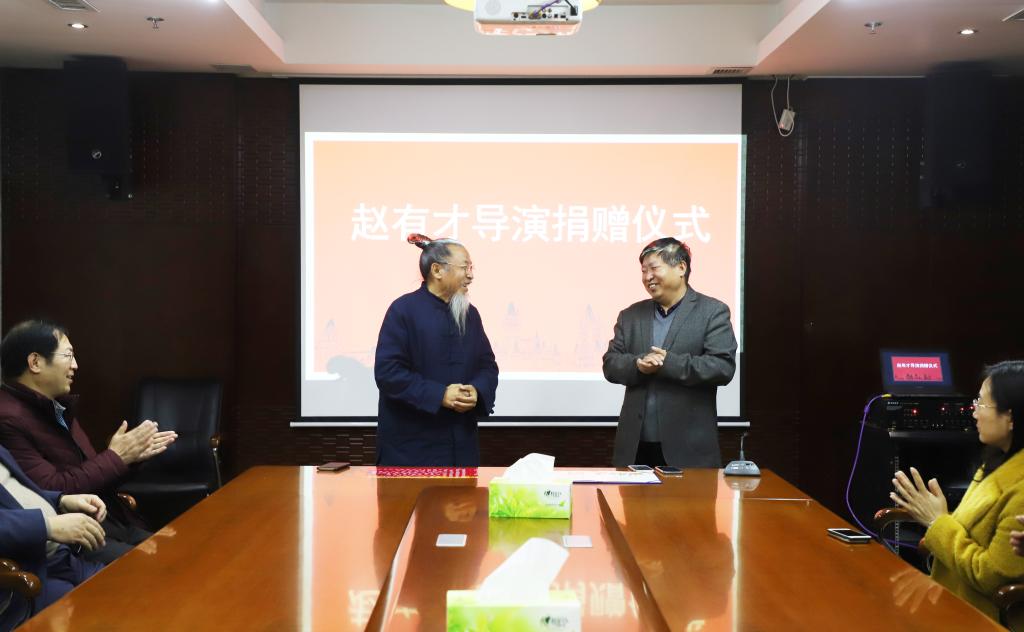 2018年11月19日下午,全国中老年春晚导演兼制片人赵有才先生向beat365官网图书馆捐赠图书影像资料仪式在仙聚山庄二楼会议室举行,校长甄忠义、图书馆馆长王志民、传媒学院院长王峰出席捐赠仪式。