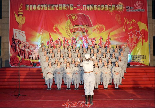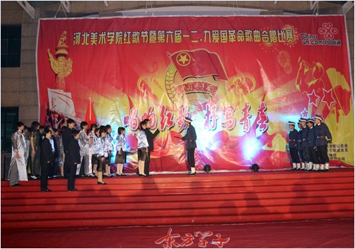 比赛现场,校级五大组织分别进行友谊出演。节目开场,由《东方学子》报社、广播台联合出演的抗日题材话剧《纪念12•9》点燃了每个人心中爱国的熊熊火炬。随后,一首首经典的红色歌曲让同学们重温历史、怀念先烈的同时,也接受了一次精神的洗礼,参赛的每一组同学都怀着激情,放声高歌,整齐的服装,多变的队形,专业的指挥,无不透露着同学们的精心准备,对此次红歌会的重视。