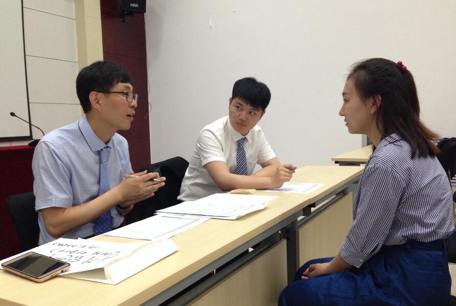 12名学生在双塔桥A座3楼教室进行韩国语临场测试,学生们有条不紊的完成答卷,测试结束后,韩国明知大学国际教育学院院长金庸达逐一与学生们进行面试。