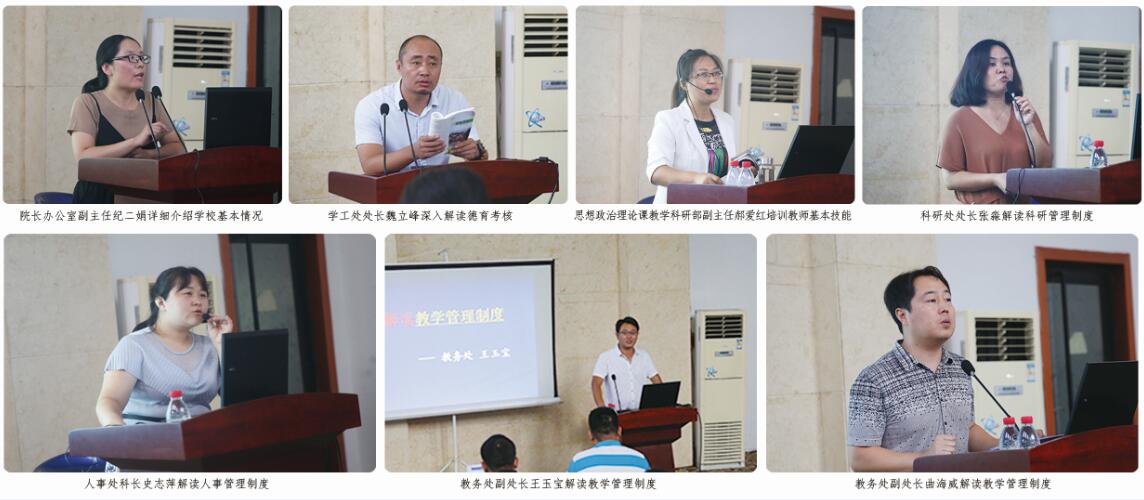 培训在人事处麻立峰处长的主持下,由院长办公室副主任纪二娟对学校的基本情况和发展逐一做了详细的介绍;学工处魏立峰处长就德育考核进行了深入地解读;思想政治理论课教学科研部副主任郝爱红就教师基本技能展开培训;科研处张淼处长、人事处史志萍科长、教务处王玉宝副处长、曲海威副处长、学工处刘占军副处长分别对科研管理制度、人事管理制度、教学管理制度及学生管理制度进行了详细地解读。