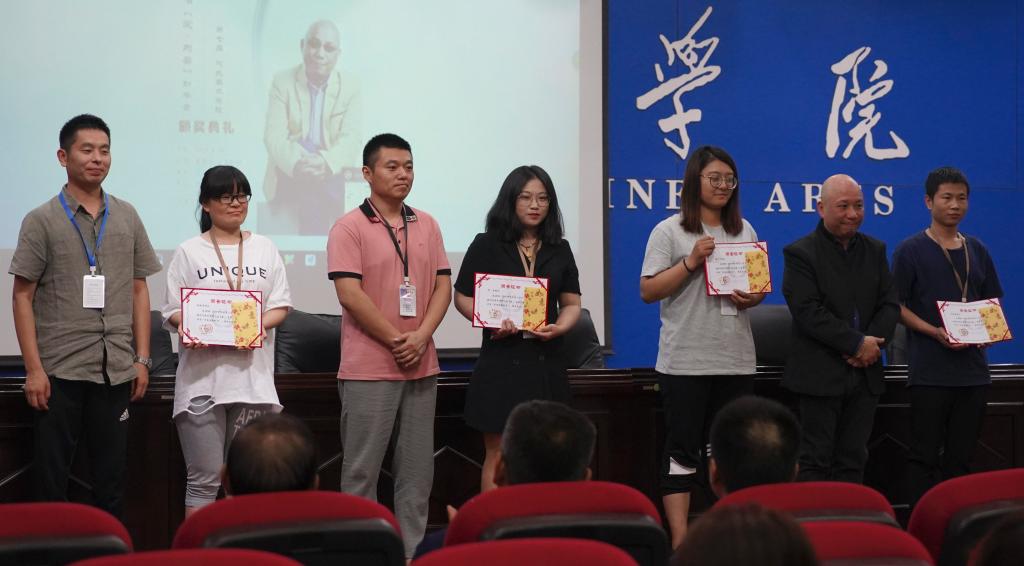 接着,颁奖仪式开始,王信导演向传媒学院捐赠无人机一台;主持人宣布获奖学生与教师名单后,学校领导为他们颁发了助学金、助教金。
