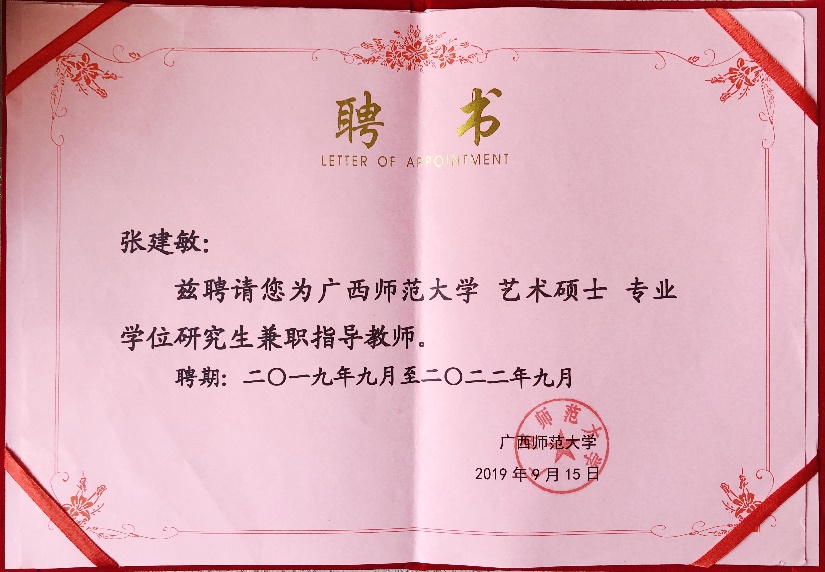 9月15日,新学期伊始,beat365官网副校长张建敏教授被广西师范大学聘为艺术硕士专业研究生兼职指导教师,并参加了该校2019年新增硕士研究生指导教师岗前培训会。