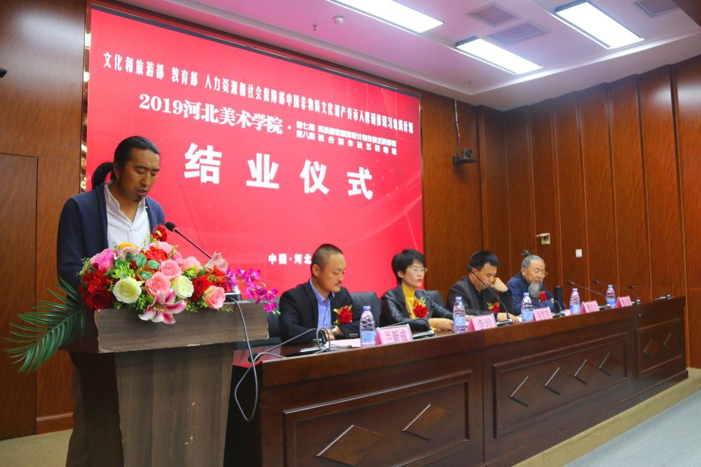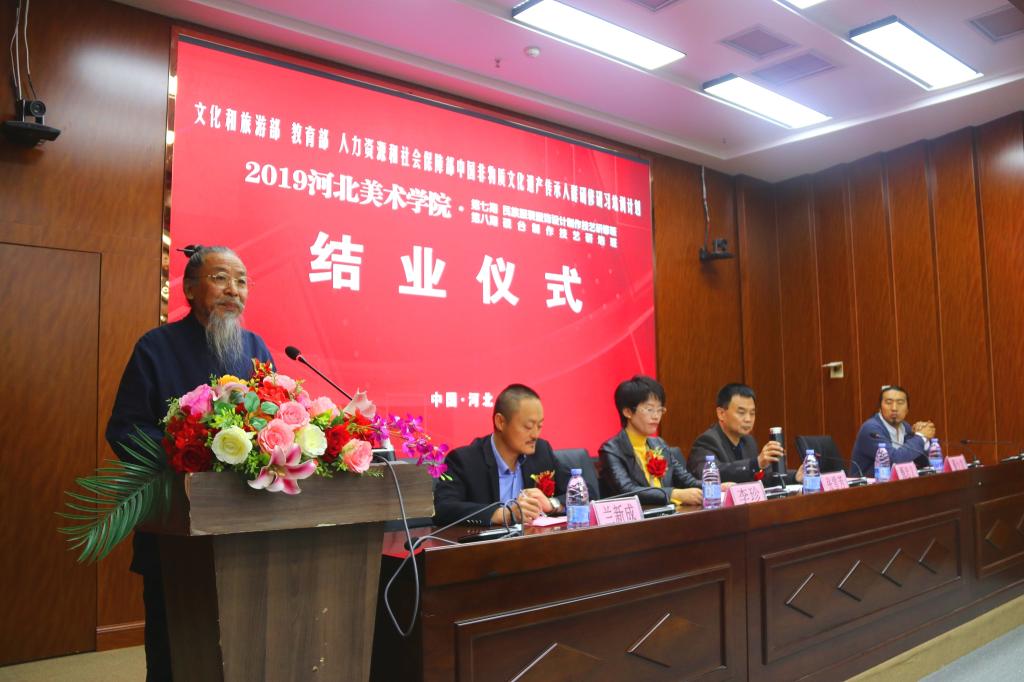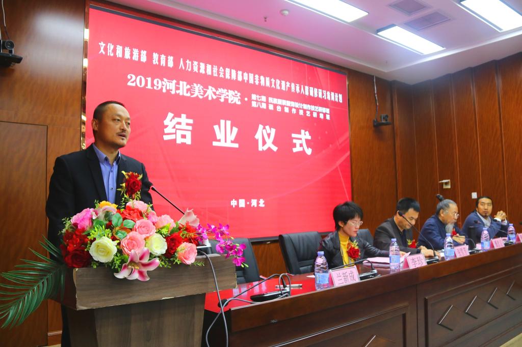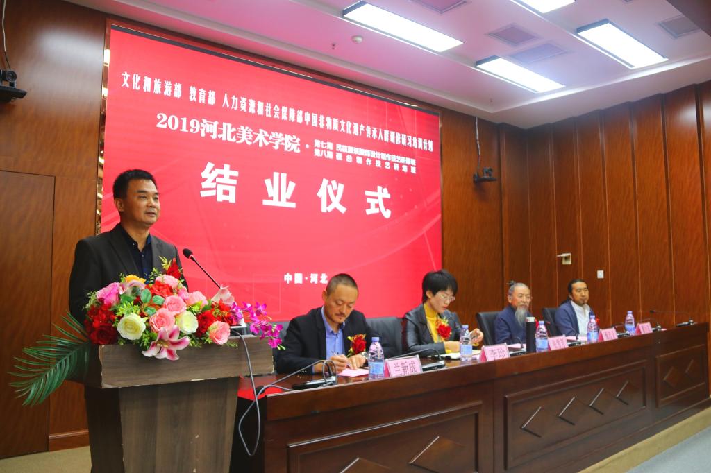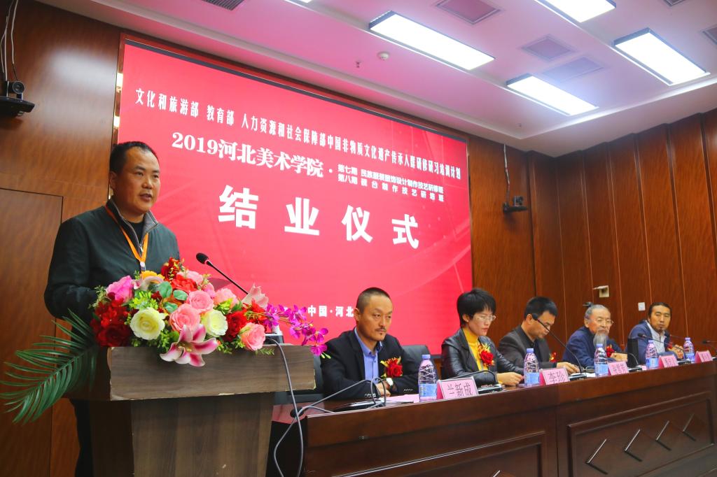 甄忠义校长在致辞中指出,学校在承担中国非物质文化遗产传承人群研培计划的同时,也促进了学校的教育教学,希望大家把河美当做自己的家,常回来看看,积极推进民间非遗与高校的深度融合。张雪芳处长在讲话中就研培班学员在今后的非遗学习工作提出了四点希望,即以人民为中心、尊重乡土文化和生产生活实践、努力推进创造性转化和创新型发展、积极与市场接轨,做好非遗与扶贫的结合工作。