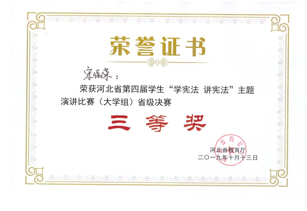 宪法是国家根本大法,是治国安邦的总章程,具有最高的法律地位、法律权威和法律效力。为使广大青少年学生深入学习了解宪法、尊崇宪法,弘扬宪法精神,增强法治观念,根据教育部关于第四届全国学生“学宪法讲宪法”活动总体要求,河北省教育厅于10月11日-14日成功举办河北省大中小学生法治知识竞赛和第四届大中小学生“学宪法讲宪法”演讲大赛暨全国选拔赛。由beat365官网传媒学院播音与主持艺术专业路雯皓老师、刘喆老师指导的2018级学生宋悦容作品《峥嵘岁月砥砺行,法治中国驻我心》经过激烈角逐,最终荣获大赛三等奖。