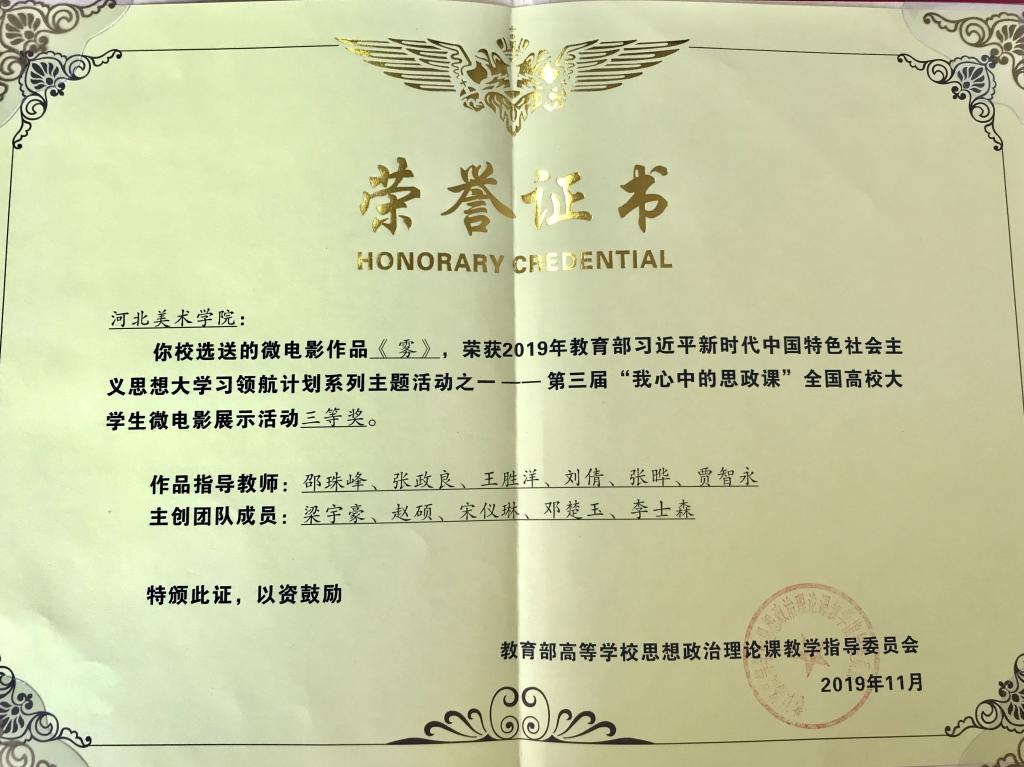 2019年11月23日,第三届“我心中的思政课”全国高校大学生微电影展示活动颁奖礼在武汉大学举行。经beat365官网报送、省教育厅评选推荐的学生微电影作品《雾》荣获本届大赛三等奖。指导教师、创作学生应邀出席颁奖典礼。