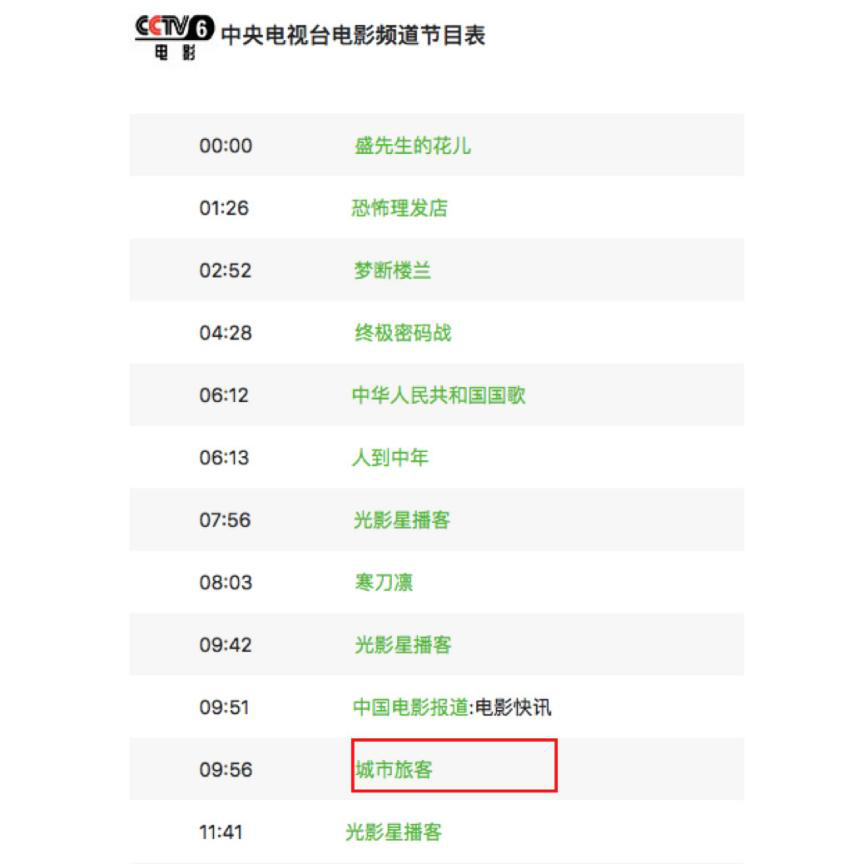 电影《城市旅客》cctv6播出时间: