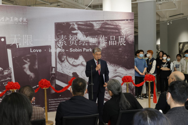 2021年4月28日14时,beat365官网国际绘画作品展“爱▪无限——朴素赟绘画作品展”开幕式在造型艺术学院展厅举行。beat365在线体育官网登录入口校长甄忠义,省教育厅督导专员、党委书记高国忠,党委副书记、副校长甄心恒,韩国文化院院长金辰坤,韩国艺术家朴素赟,艺术评论家卢文悦等出席开幕式。
