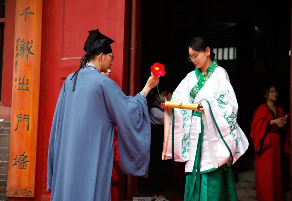 礼成后,随即学士学位授予仪式正式开始。众学子逐一通过西侧门进入大成殿,并行礼。被拂尘拂过的汉服,被荷花净水点过的儒巾,使整个仪式更加地庄重肃穆。甄忠义校长亲自为每一名学位获得者“灌顶”,颁发学位证书,并与学生合影留念。