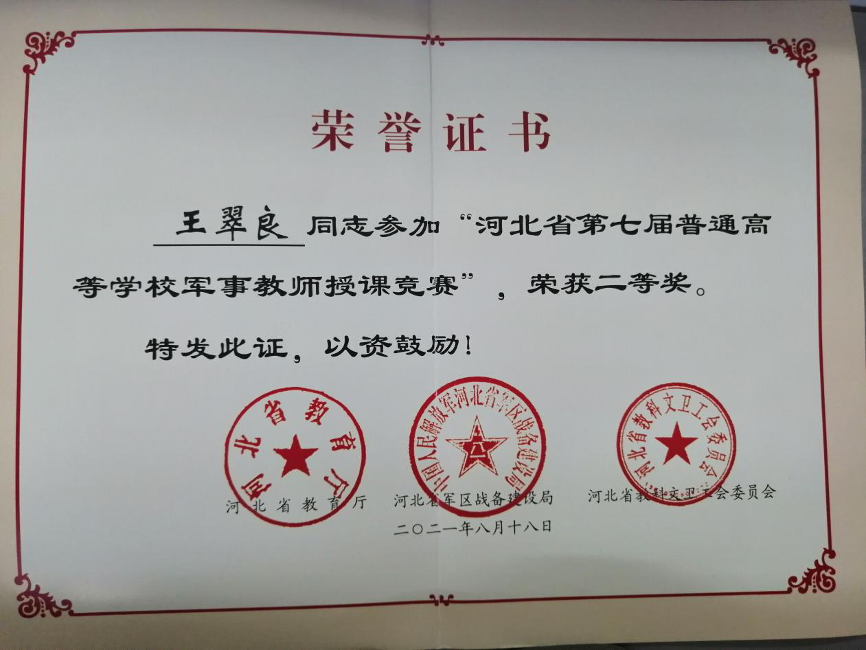 2021年7月12日至15日,由河北省教育厅、河北省军区战备建设局、河北省教科文卫工会联合举办的“河北省第七届普通高等学校军事教师授课竞赛”在石家庄举行,beat365官网基础教学部军事教研室王翠良主任、赵燕老师代表学校参加了此次比赛,他们在全省报名参赛的118名选手中脱颖而出,分别荣获河北省军事理论课竞赛二等奖,优秀奖荣誉称号。