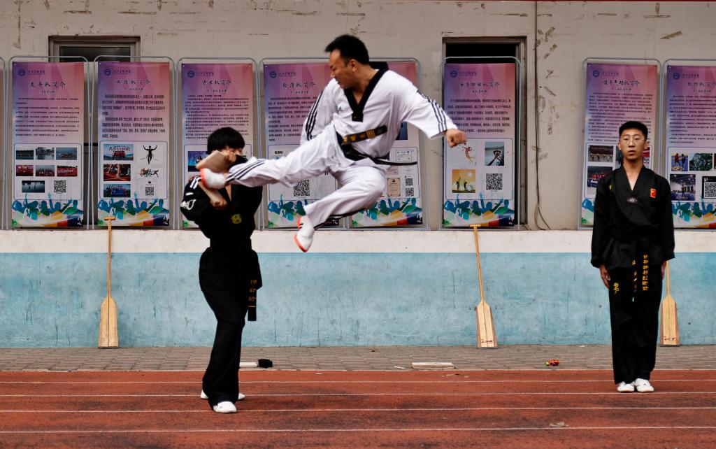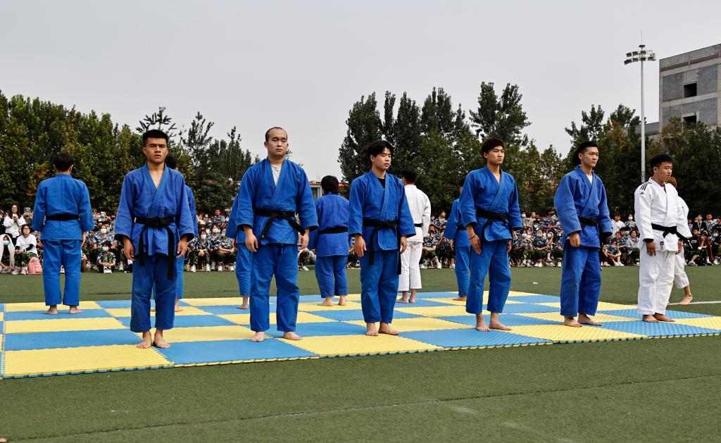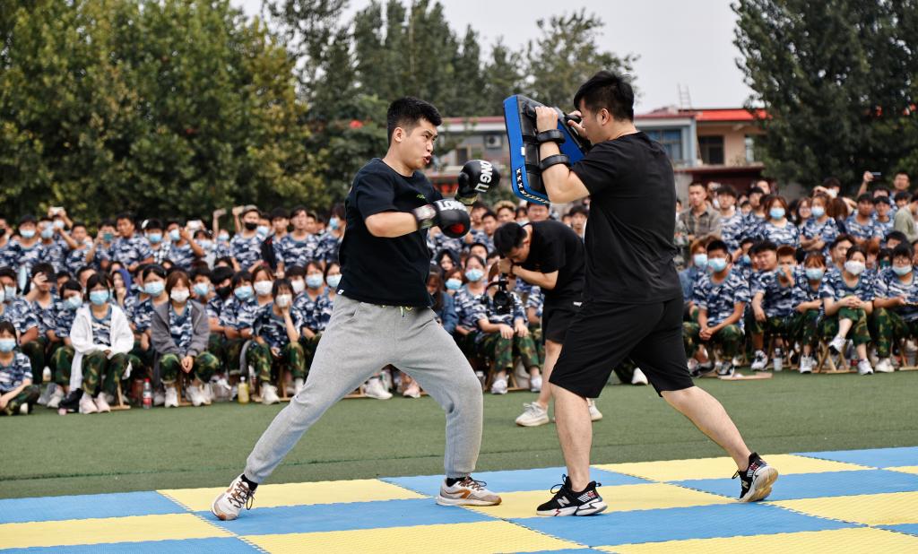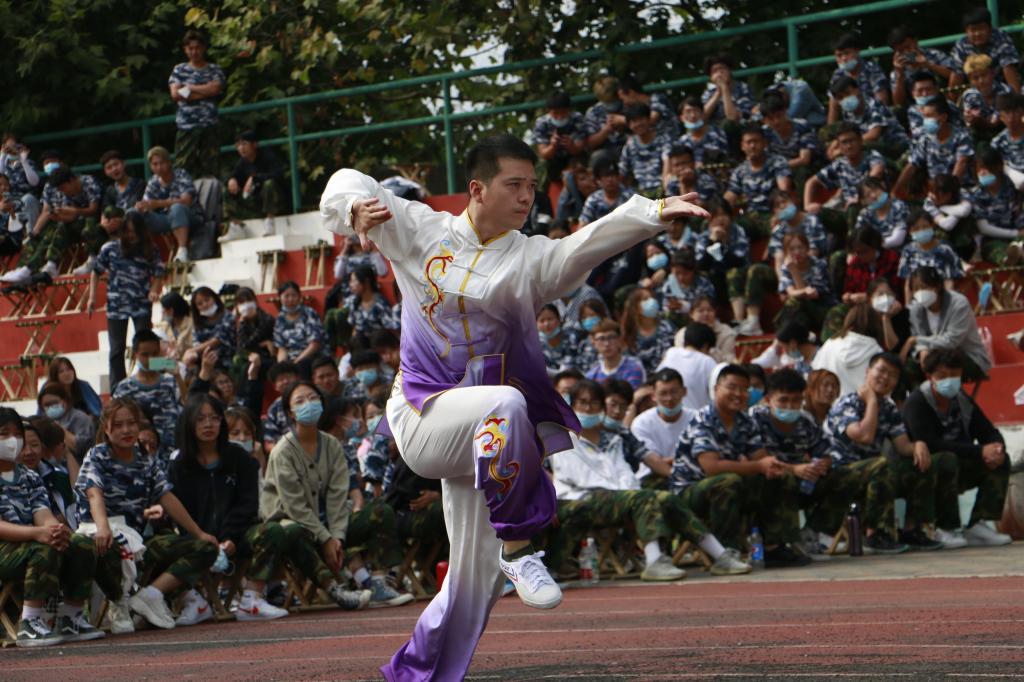 随后体育工作部教师及运动训练队员进行了排球、跆拳道、健身气功、乒乓球、空竹、柔道、散打、足球、啦啦操、武术、体适能、街舞等12个教学项目的展演活动。精彩的项目展演引来了新同学的阵阵呐喊声、助威声,这也对接下来的专项选修教学起到了引领和示范作用。