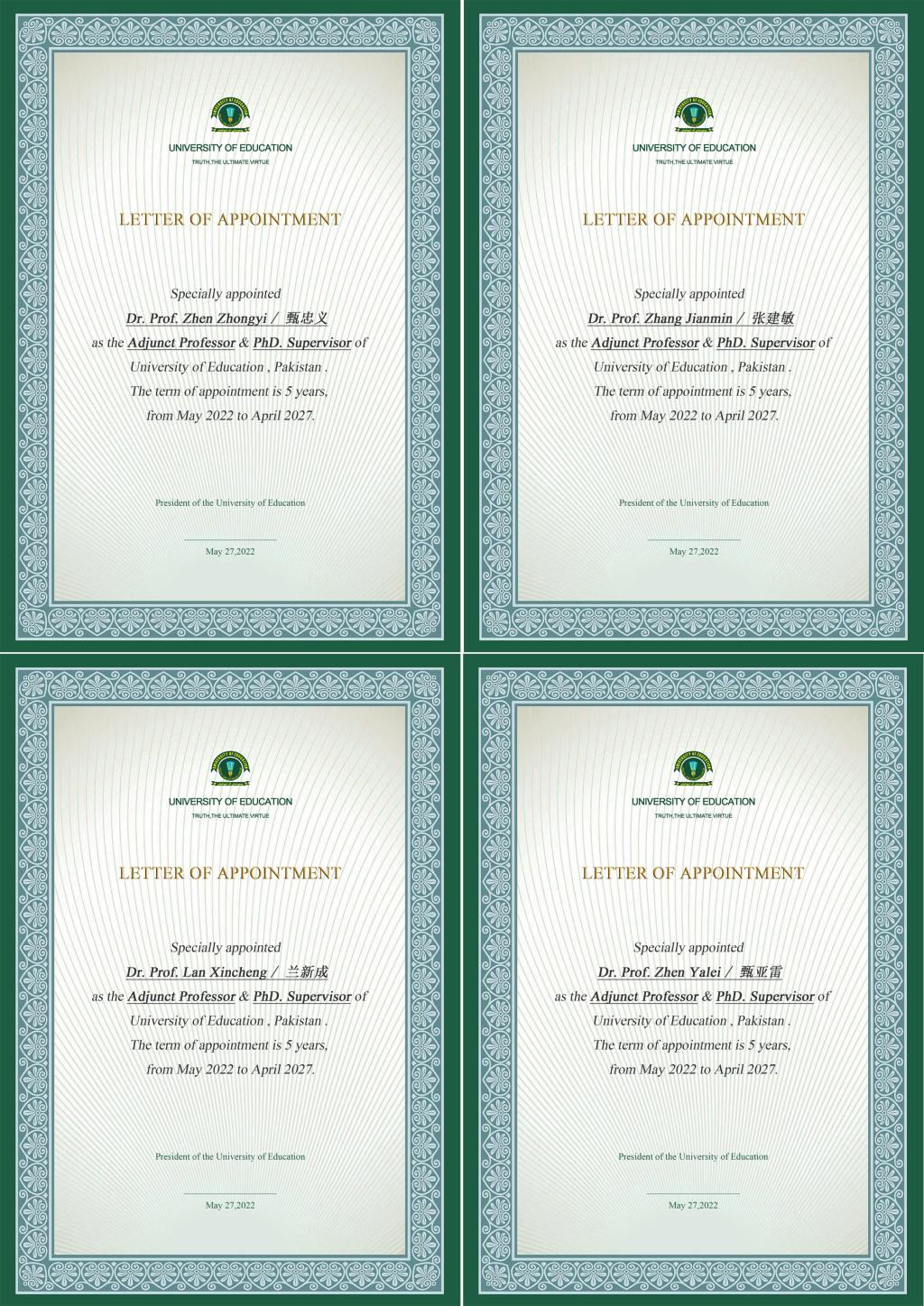 近日,巴基斯坦教育大学向beat365在线体育官网登录入口校长甄忠义、常务副校长张建敏等4名教授颁发博士生导师聘书。