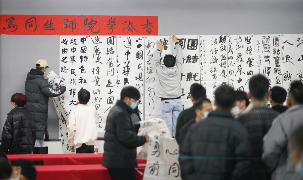 为贯彻落实党的二十大精神和中共中央决策部署,书法学院于11月16日在6号教学楼505室举行师生同书“党的二十大金句”活动。书法学院党总支副书记、副院长李金梅,书法学院副院长李会芳,学院教师代表、学生代表等40余人参与。“中国共产党的中心任务就是团结带领全国各族人民全面建成社会主义现代化强国、实现第二个百年奋斗目标,以中国式现代化全面推进中华民族伟大复兴”“团结奋斗是中国人民创造历史伟业的必由之路”“江山就是人民,人民就是江山”一幅幅作品,把党的二十大报告中的重要论述,一字一句隽永水墨之中。这次活动,书法学院师生利用专业知识同场竞技,现场气氛热烈,师生情绪高涨,不仅赋予中华优秀传统文化新的内涵,创新中华优秀传统文化的当代表达,更掀起了师生学习宣传贯彻党的二十大精神热潮,把师生的思想和行动统一到党的二十大精神上,把师生的智慧和力量凝聚到完成党的二十大确定的各项目标任务上。