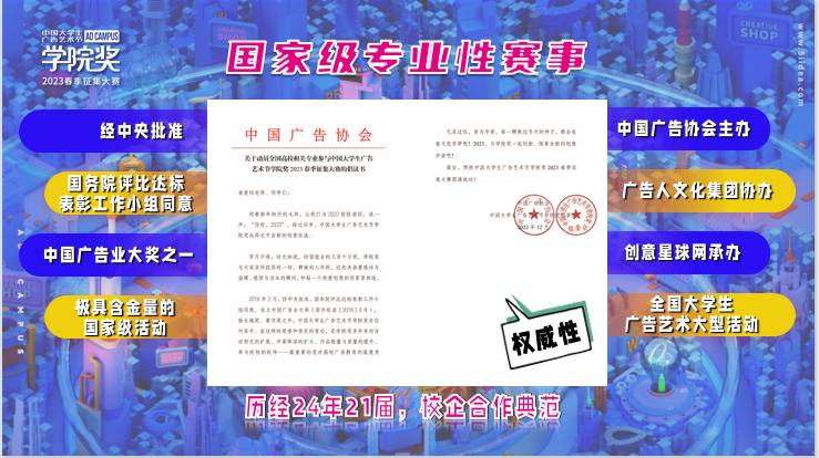 中国大学生广告艺术节学院奖是经中央批准,国务院评比达标工作小组同意,中国广告协会主办的全国大学生广告艺术大型活动,是中国广告业大奖之一,历经24年21届,是中国校企合作的典范。