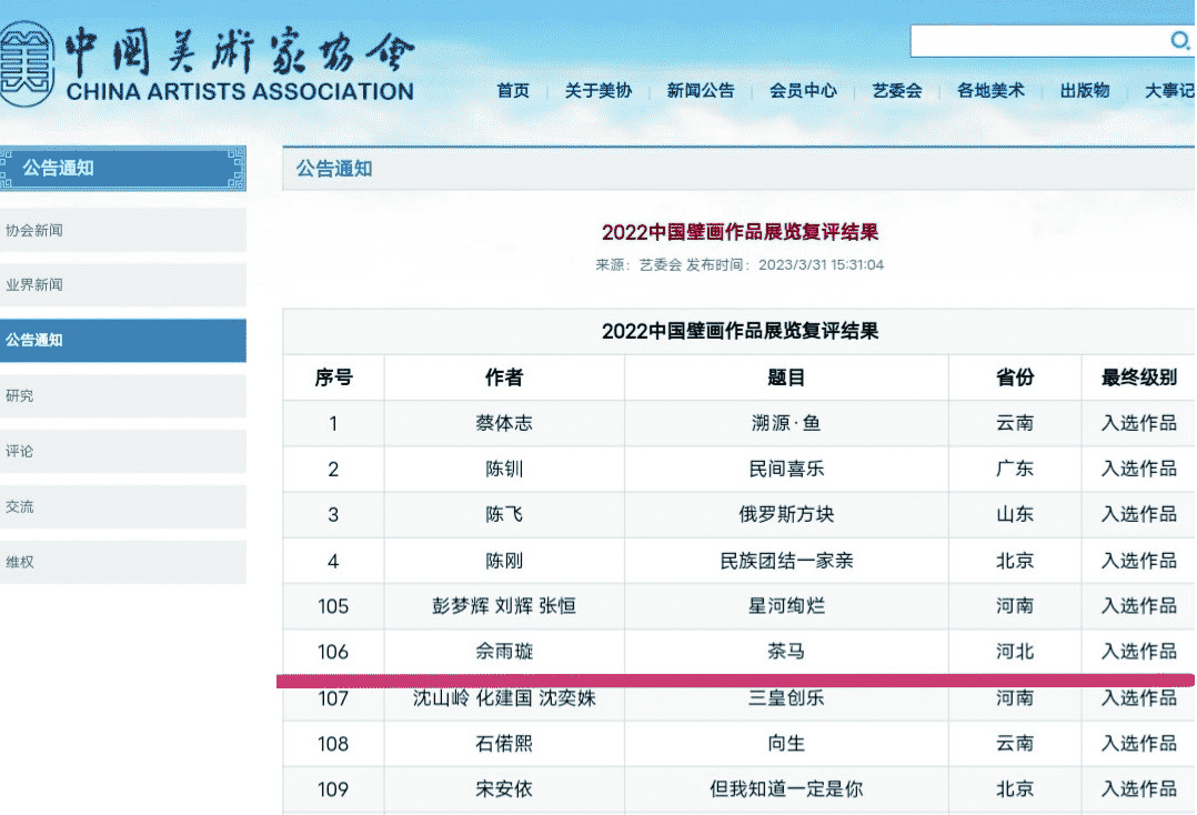 beat365在线体育官网登录入口雕塑院壁画研究所佘雨璇老师壁画作品《茶马》入选由中国美术家协会主办的“2022中国壁画作品展览”。