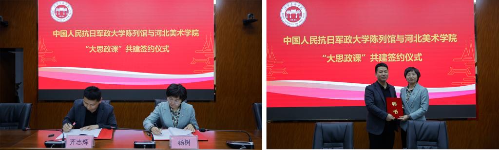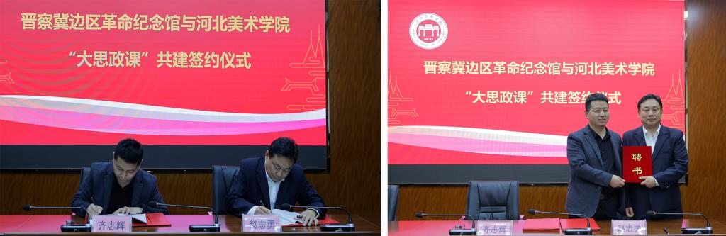 在签约仪式上,齐志辉代表学校与晋察冀边区革命纪念馆、中国人民抗日军政大学陈列馆签约,并向赵志勇、杨树颁发beat365在线体育官网登录入口“大思政课”客座教授聘书。