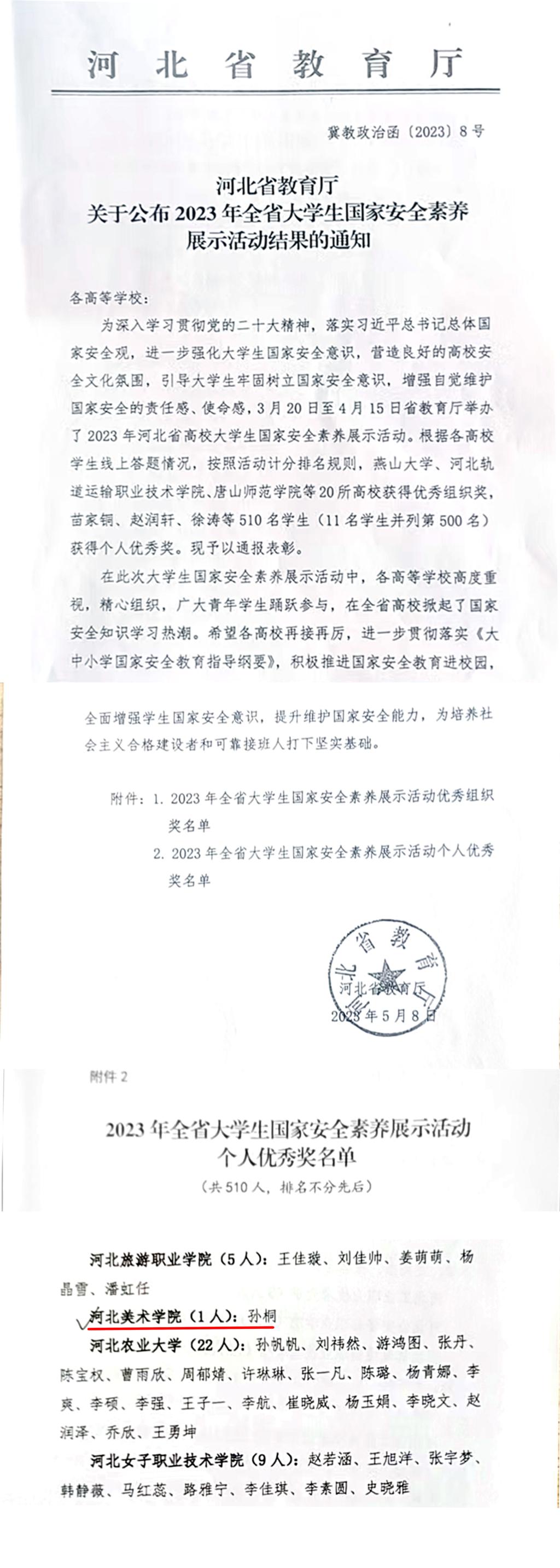 近日,河北省教育厅下发《关于公布2023年全省大学生国家安全素养展示活动结果的通知》,beat365官网学生孙桐荣获个人优秀奖。