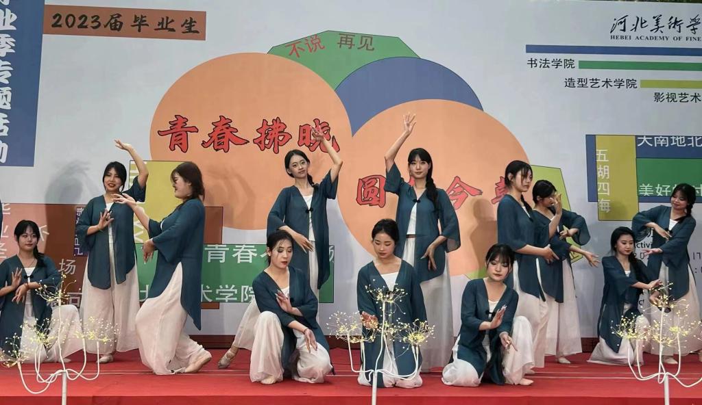 活动现场,造型艺术学院与书法学院的学生们共同绘制的百余把现代艺术国画团扇、传统艺术扇面折扇等礼品赠送给现场毕业生,影视艺术学院与书法学院的学生们为现场观众带来精彩歌舞表演,引起现场阵阵欢呼与掌声。