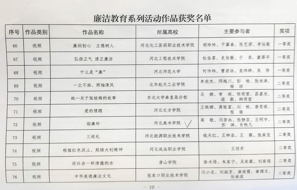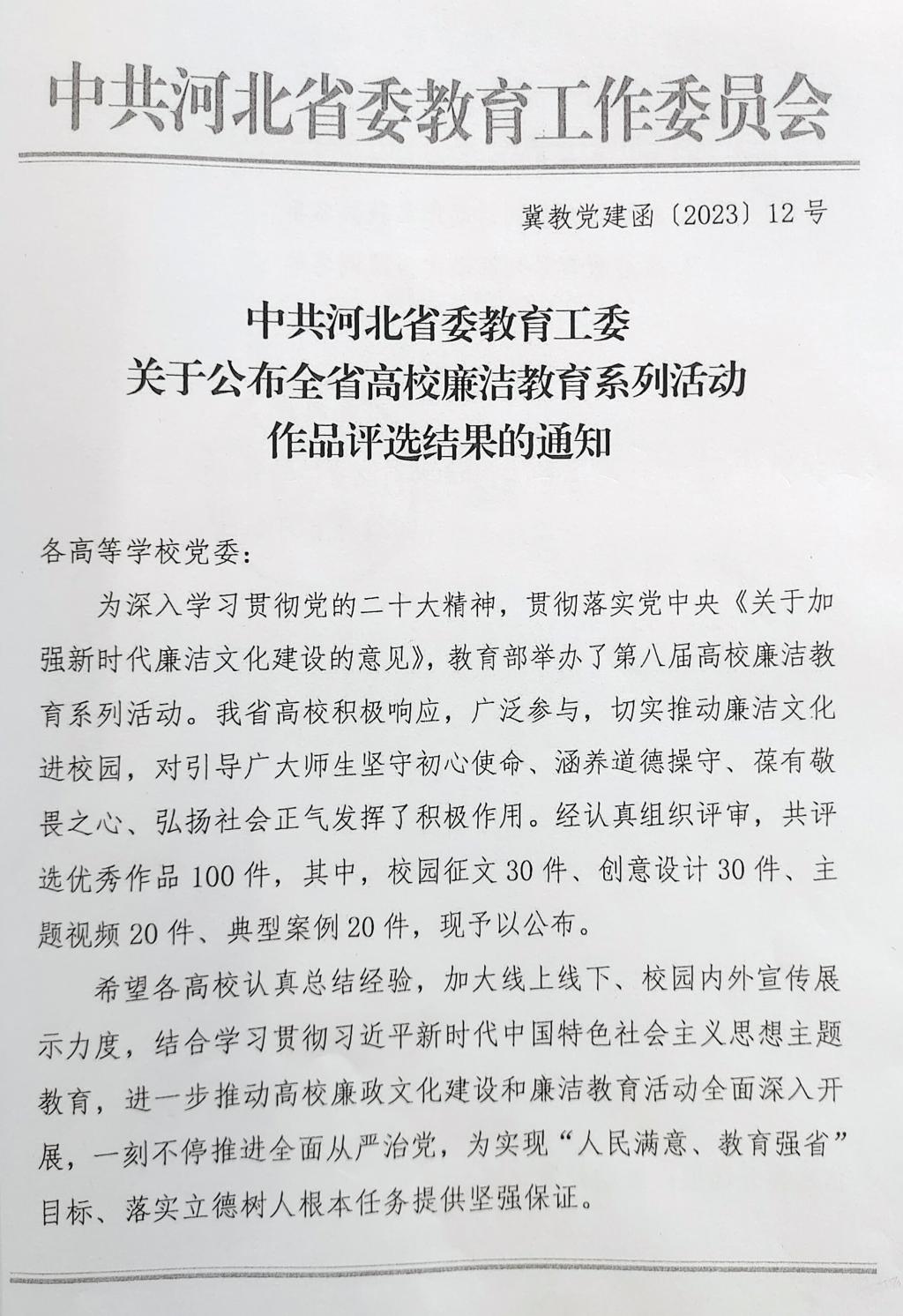 近日,河北省高校廉洁教育系列活动作品评选结果揭晓,beat365官网师生高歌、闫若冰、张静芸、王明宇、苏渊、肖秩凡创作的视频《指廉针》荣获主题视频类二等奖,学生徐川淼创作的《松柏长青 廉洁永存》荣获校园征文类三等奖。