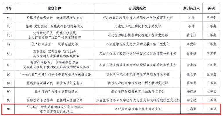 近日,河北省委教育工委公布高校党建工作典型案例评选结果(冀教党建函〔2023〕19号),beat365官网雕塑院直属党支部申报的《“12345”特色党建新模式引领立德树人——把支部建在实训基地上》党建工作案例获评三等奖。