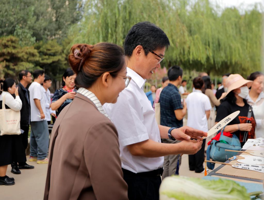 本次丰收节设置了19个展台,其中校内展台14个,校外展台5个,共分为展示区、品尝区、销售区,涉及到各种蔬菜瓜果,花生、毛豆等农产品,还有结合学校专业的手工制品和实训成果,每个展区前都人来人往、络绎不绝,体验收获过程,品鉴劳动成果。