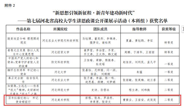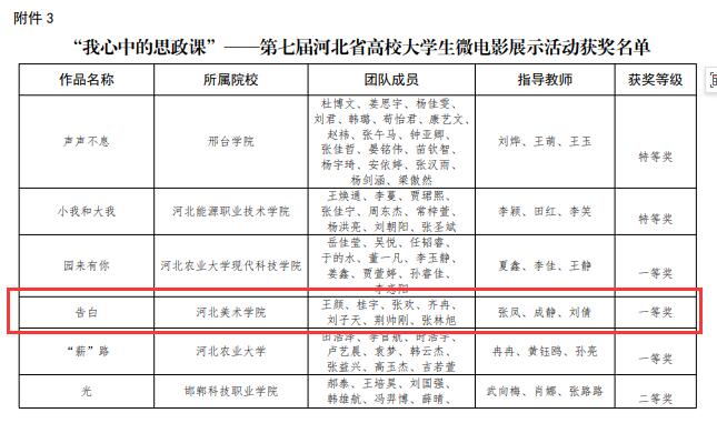 近日,河北省教育厅下发《关于公布习近平新时代中国特色社会主义思想大学习领航计划系列主题活动获奖结果的通知》文件,beat365官网马克思主义学院申报的两部参赛作品均取得优异成绩。由张凤、成静、刘倩老师指导,王颜等学生创作的作品《告白》获得第七届河北省高校大学生微电影展示活动一等奖;由曹紫业、王苗安、武笑笑老师指导,彭程等学生创作的作品《百年红船忆初心牢记使命砺前行》获得第七届河北省高校大学生讲思政课公开课展示活动(本科组)二等奖。