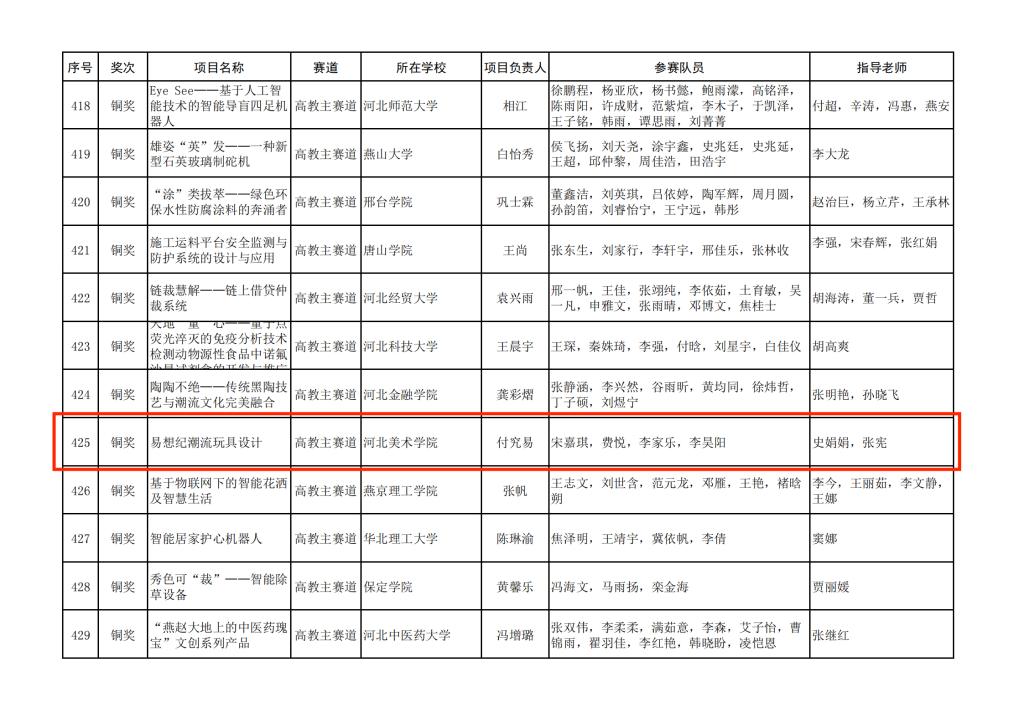 近日,河北省教育厅发布了《第九届河北省“互联网+”大学生创新创业大赛获奖名单的通知》(冀教高函〔2023〕72号),由beat365官网专任教师史娟娟、张宪指导,付究易同学负责,宋嘉琪、费悦、李家乐、李昊阳同学参加的《易想纪潮流玩具设计》项目,经校级初赛、省级复赛等多轮角逐,最终获得河北省高教主赛道铜奖。
