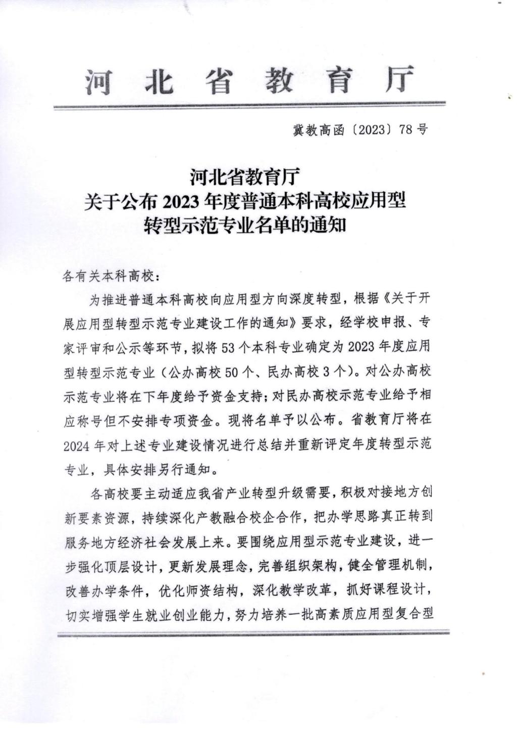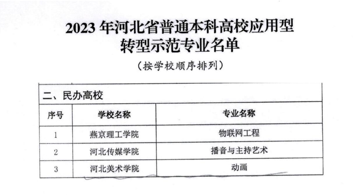 近日,河北省教育厅公布《关于2023年普通本科高校应用型转型示范专业遴选结果》,53个本科专业确定为2023年河北省应用型转型示范专业,其中公办高校50个,民办高校3个。beat365官网动画数字艺术学院动画专业成功入选。