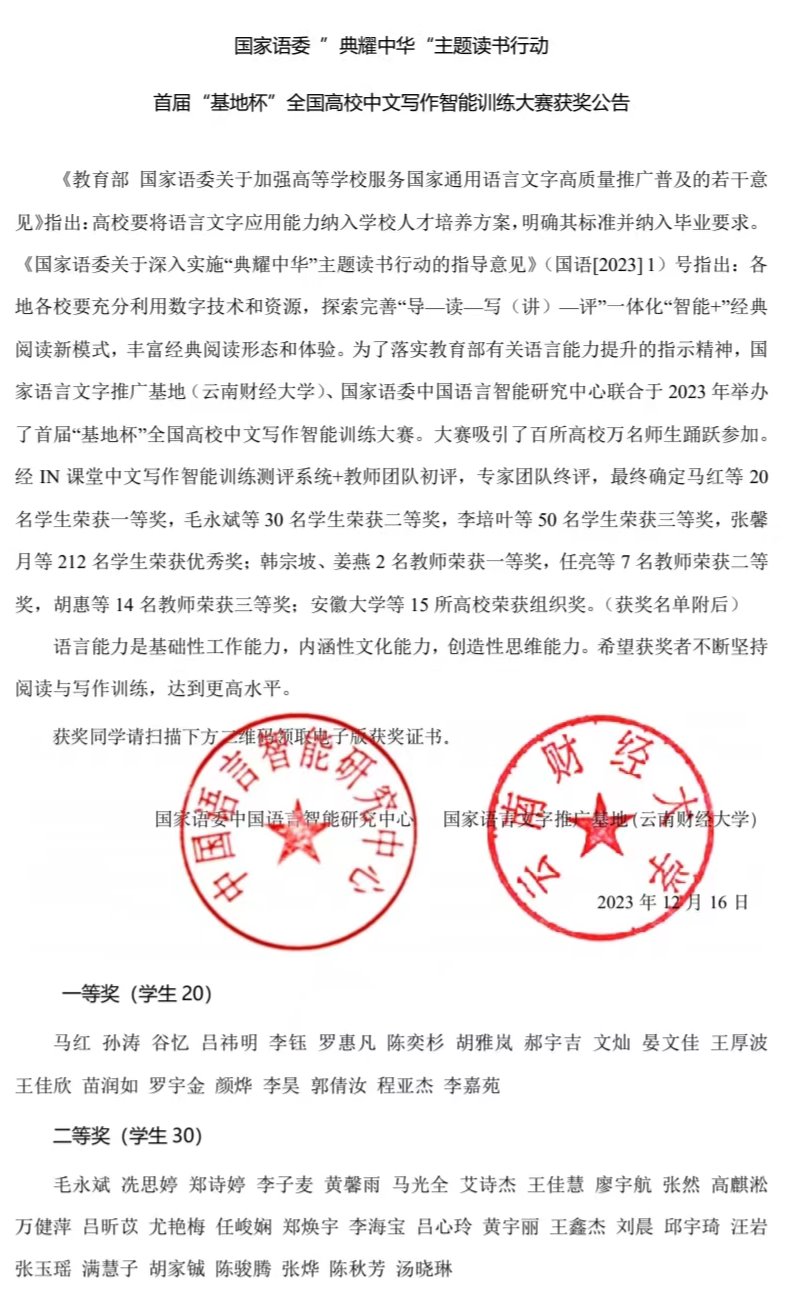 12月16-17日,第四届中国智能教育大会暨第六届中国语言智能大会在四季如春、景美情深的云南春城召开。会上,国家语委 “典耀中华”主题读书行动·首届“基地杯”全国高校中文写作智能训练大赛举行颁奖仪式。本次大赛颁奖典礼beat365官网共有学生组一等奖1名,二等奖1名,三等奖2名,优秀奖15人。