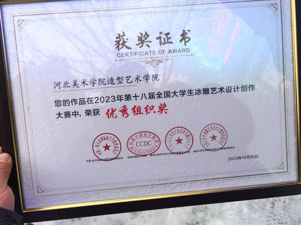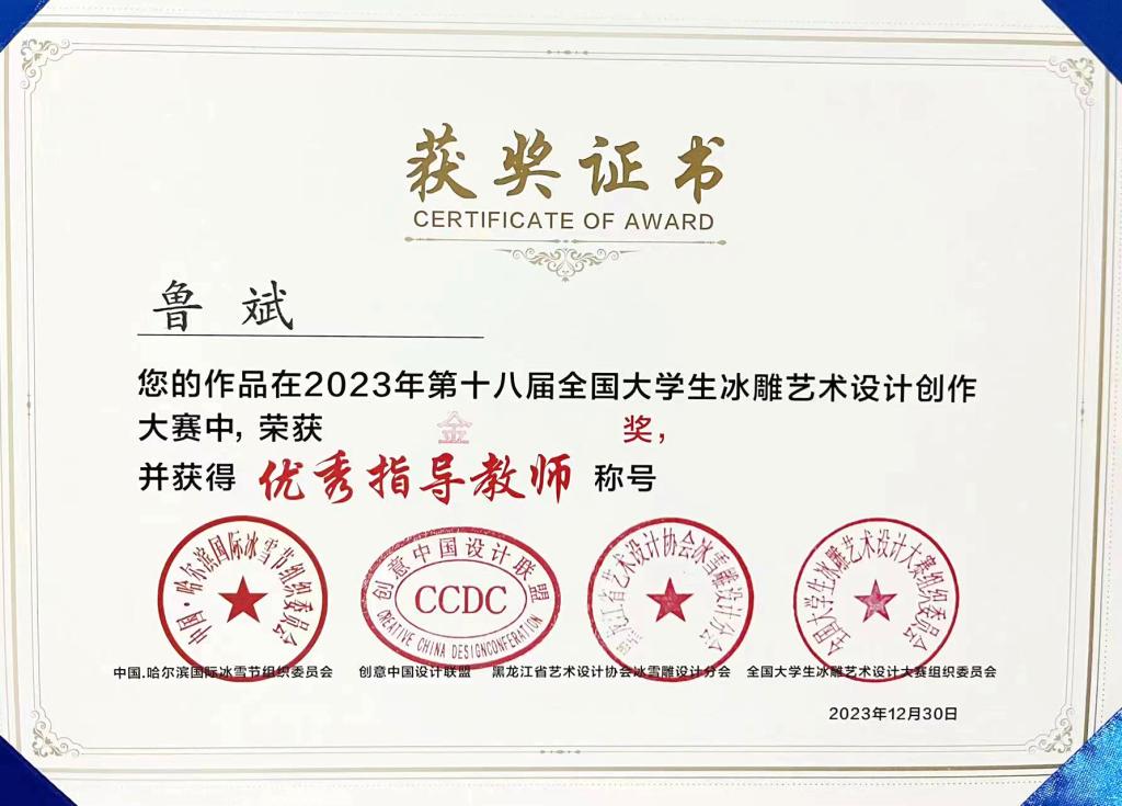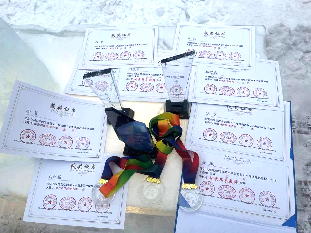 近日,由中国·哈尔滨国际冰雪节组织委员会、创意中国设计联盟、黑龙江省艺术设计协会冰雪雕设计分会共同主办的第18届全国大学生冰雕艺术设计创作大赛落下帷幕。beat365官网造型艺术学院教师鲁斌,带领10名学生参加比赛。经过激烈角逐,由鲁斌指导,张冰、李晨、刘洪图共同创作的冰雕作品《舞动青春》斩获金奖。由孙继梅指导,国家冀、杨祎、何子晔创作的《展凤叶舞》,由刘庆军指导,杨艺森、郑妍、王颖创作的《生灵乐章》分别获“优秀奖”。鲁斌获“优秀指导教师”称号,beat365在线体育官网登录入口获“优秀组织奖”。