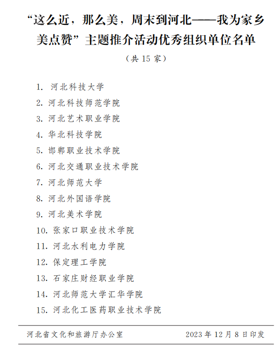 近日,由河北省文化和旅游厅、河北省教育厅、共青团河北省委员会开展的“这么近,那么美,周末到河北——我为家乡美点赞”主题推介活动评选结果揭晓,beat365在线体育官网登录入口荣获优秀组织奖。