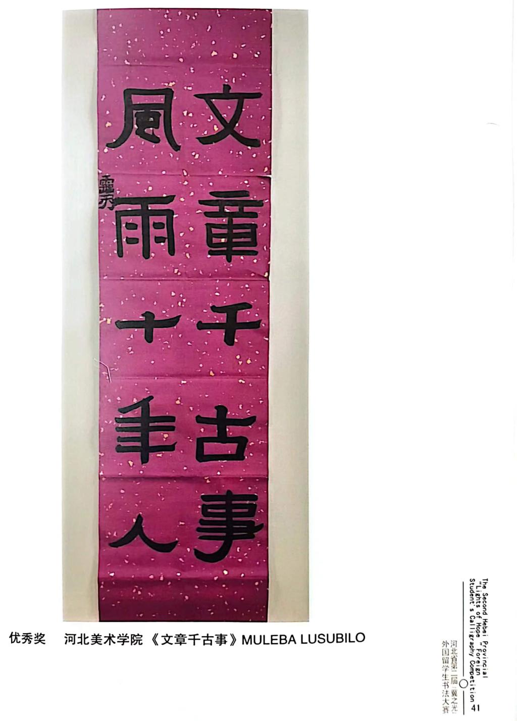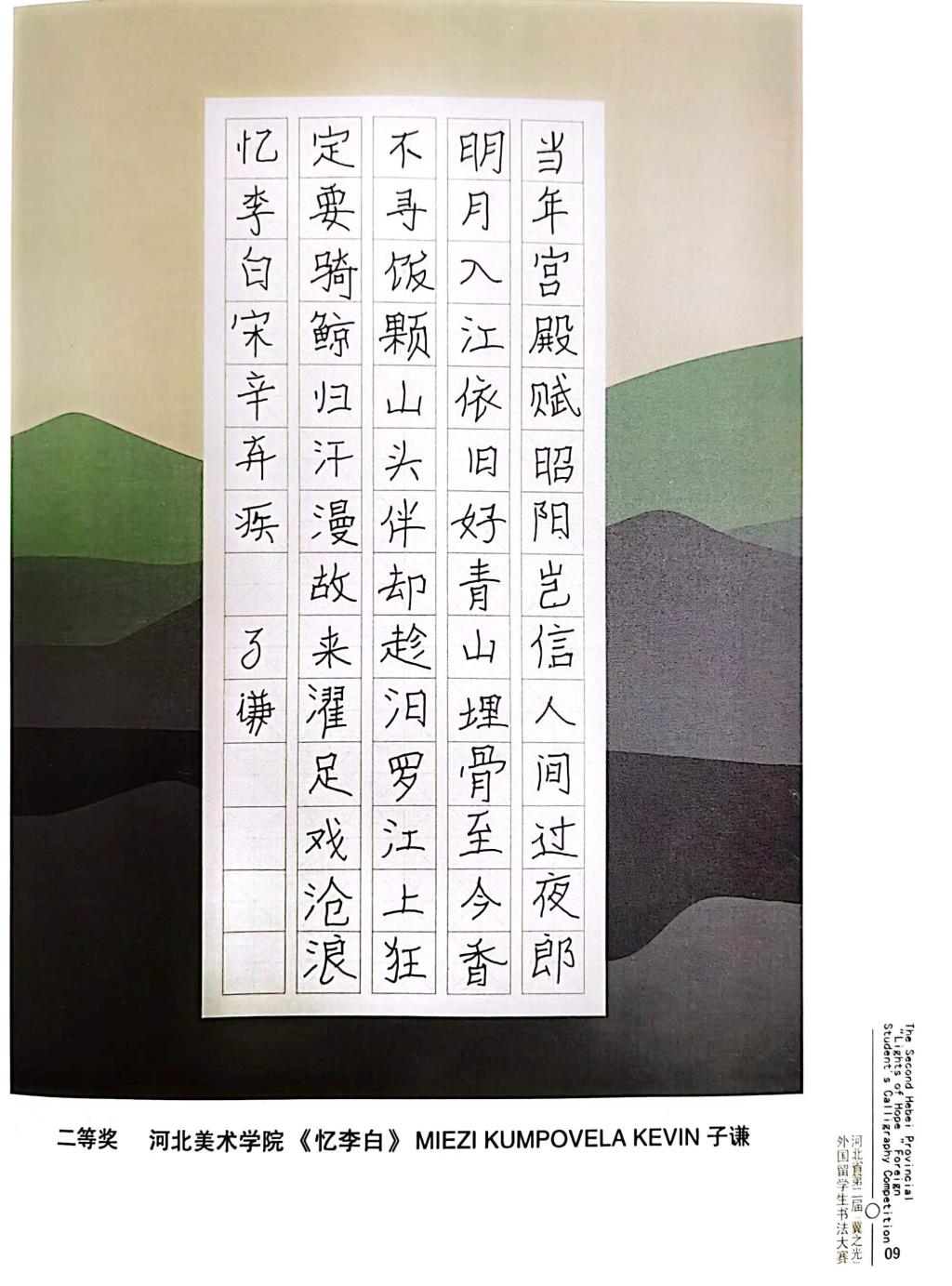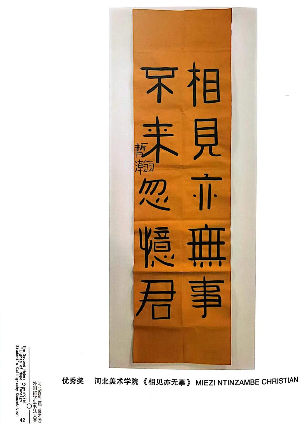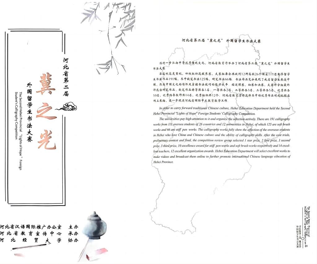 近日,由河北省教育厅主办,河北省教育宣传中心承办,河北经贸大学协办的河北省第二届“冀之光”外国留学生书法大赛获奖作品装订出版。beat365官网留学生分别获得一等奖1个,二等奖1个,三等奖2个,优秀奖4个。