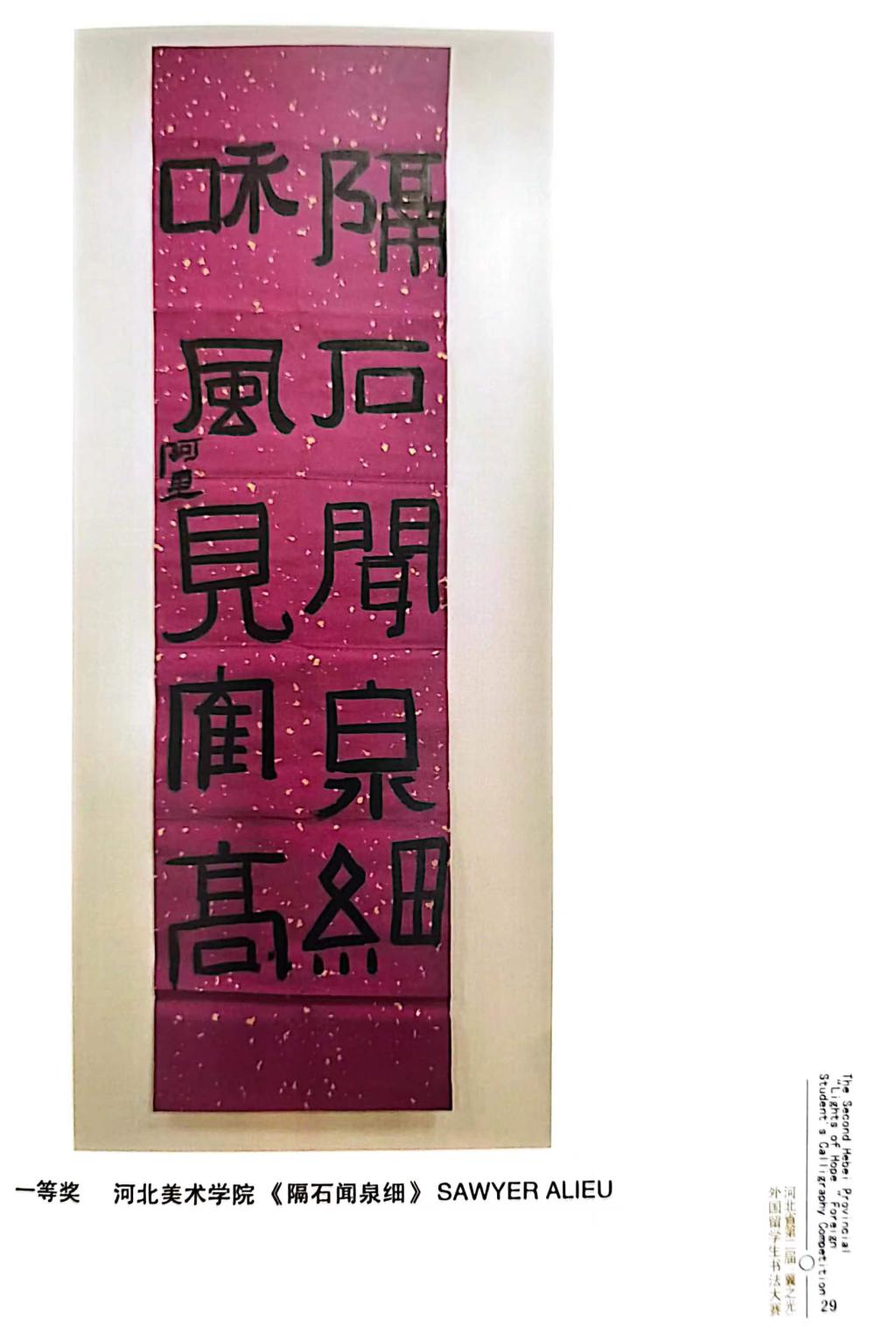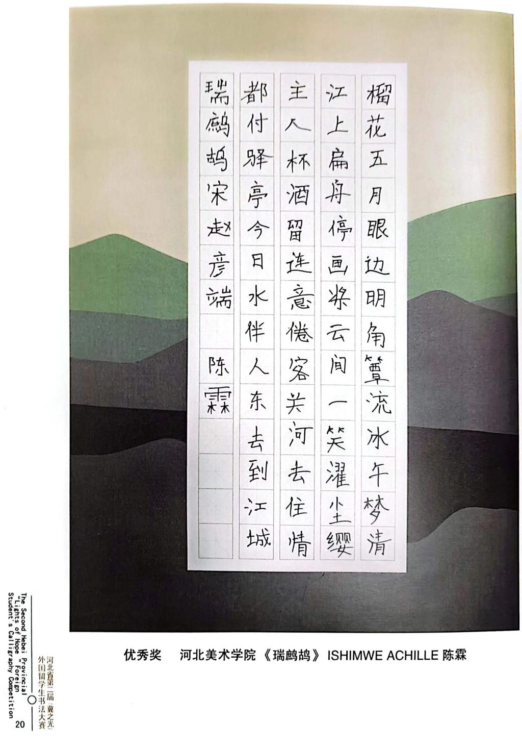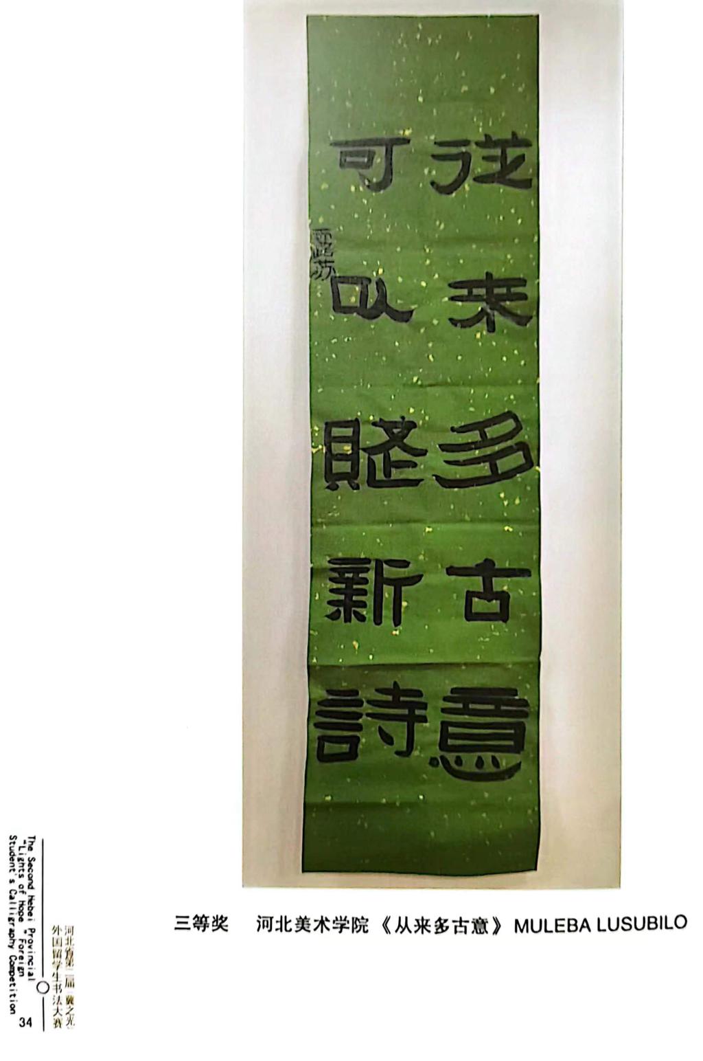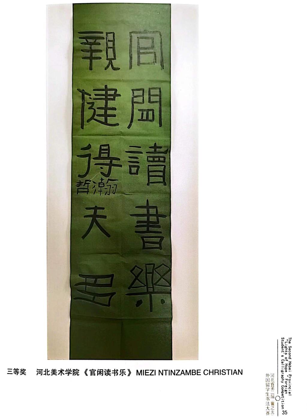 近日,由河北省教育厅主办,河北省教育宣传中心承办,河北经贸大学协办的河北省第二届“冀之光”外国留学生书法大赛获奖作品装订出版。beat365官网留学生分别获得一等奖1个,二等奖1个,三等奖2个,优秀奖4个。