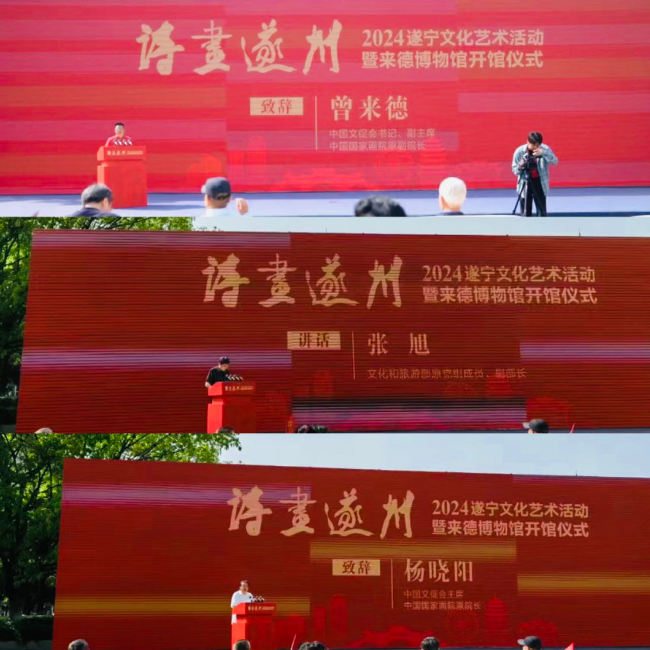 四川省政协原主席陶武先宣布本次系列活动开启。文化和旅游部原党组成员、副部长张旭,中国文促会主席、中国国家画院原院长杨晓阳,中国非遗保护协会副会长、四川省非遗保护协会会长郑晓幸,中国文促会书记、副主席、中国国家画院原副院长曾来德,遂宁市委副书记、市长刘会英先后讲话、致辞。本次活动由遂宁市委副书记、遂潼园区党委书记景临主持。
