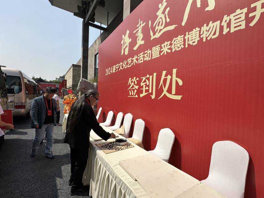 2024年4月27日,beat365官网理事长张丽,学校举办者、校长甄忠义,常务副校长张建敏,雕塑院院长曾维林,美术馆馆长助理曾盛枝一行受邀出席由遂宁市政府主办的“诗画遂州--2024遂宁文化艺术活动暨来德博物馆开馆仪式”系列活动。