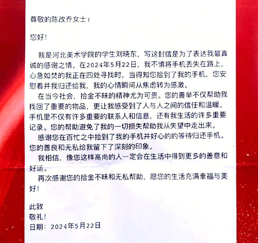 刘晓东同学说:“在当今社会,拾金不昧的精神尤为可贵。您的善举不仅帮助我找回了重要的物品,更让我感受到了人与人之间的信任和温暖。手机里不仅有许多重要的联系人和信息,还有我生活的许多重要记录。您的帮助避免了我的一切损失,帮助我从失望中走出来。”