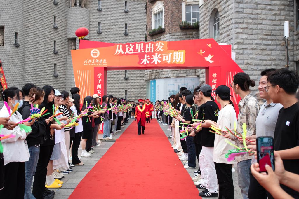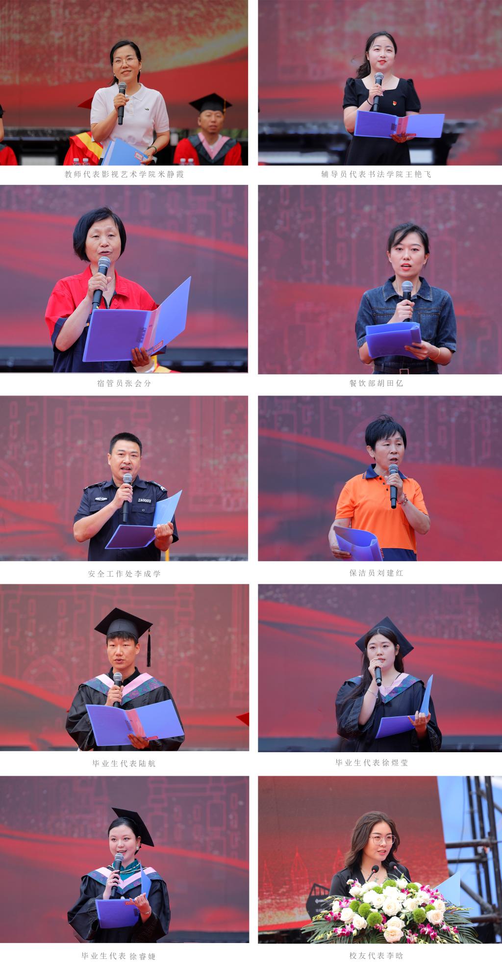 教师代表影视艺术学院米静霞、辅导员代表书法学院王艳飞、宿管员张会芳、餐饮部胡田亿、安全工作处李成学、保洁员刘建红分别发表临别赠言,表达了对毕业生的牵挂与不舍,并送上了美好的祝福。毕业生代表陆航、徐煜莹、徐睿婕向学校领导的关心关爱和老师的悉心教导表示感谢,表示定会牢记学校的嘱托,学知识、长本领、修品德,争做不负人民、不负社会的栋梁之材。校友代表李晗鼓励毕业生们要坚定梦想,勇敢前行。