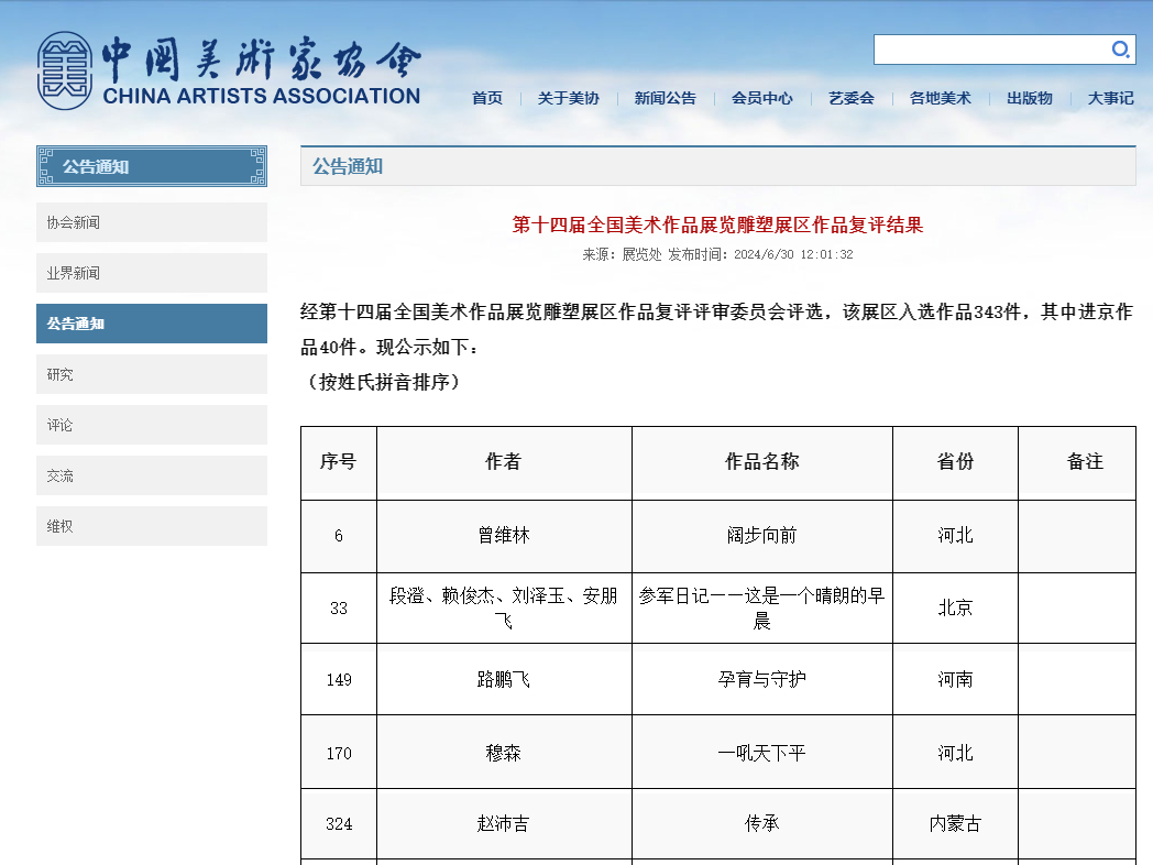 近日,经第十四届全国美术作品展览雕塑展区作品复评评审委员会评选,beat365官网共有五件雕塑作品入展,其中雕塑与公共艺术学院四件作品,包括毕业生赵沛吉作品《传承》、教师穆森作品《一吼天下平》、教师路鹏飞作品《孕育与守护》、教师段澄作品《参军日记——这是一个晴朗的早晨》;雕塑院一件作品,即教师曾维林作品《阔步向前》。