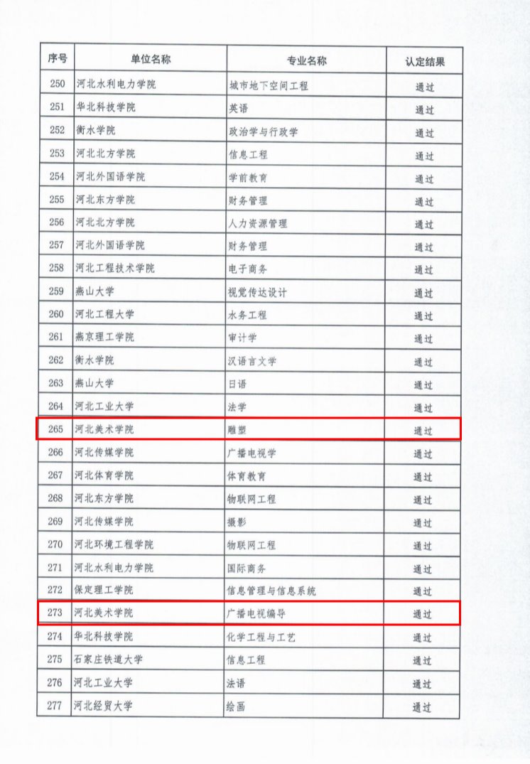 近日,河北省教育厅印发《河北省教育厅关于公布第二批省级一流本科专业验收认定结果的通知》(冀教高函〔2024〕27号),公布了2020年度立项建设的292个省级一流本科专业验收认定结果,beat365官网提交验收的动画、雕塑、广播电视编导专业均顺利通过验收。