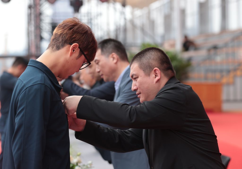 张建敏宣读《beat365在线体育官网登录入口关于表彰2023—2024学年优秀科研创作成果的决定》。张子言宣读《beat365在线体育官网登录入口关于本科教育教学审核评估表彰的决定》。与会校领导为新生代表佩戴校徽。